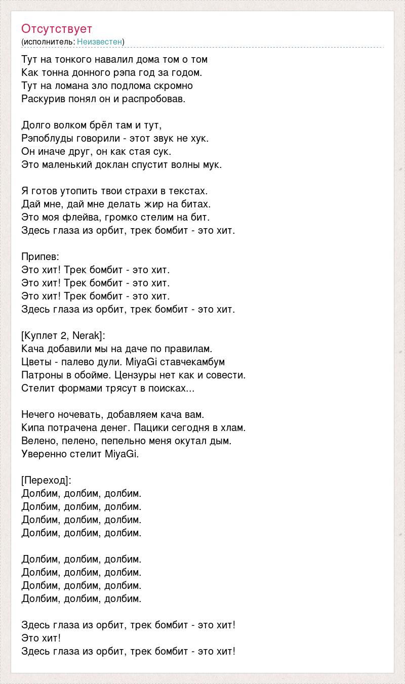 Тут на тонкого навалил дома том о том Как тонна донного рэпа год за годом. Тут на ломана зло подлома скромно Раскурив понял он и распробовав. Долго волком брёл там и тут, Рэпоблуды говорили - этот звук не хук. Он иначе друг, он как стая сук. Это маленький доклан спустит волны мук. Я готов утопить твои страхи в текстах. Дай мне, дай мне делать жир на битах. Это моя флейва, громко стелим на бит. Здесь глаза из орбит, трек бомбит - это хит. Припев: Это хит! Трек бомбит - это хит. Это хит! Трек бомбит - это хит. Это хит! Трек бомбит - это хит. Здесь глаза из орбит, трек бомбит - это хит. [Куплет 2, Nerak]: Кача добавили мы на даче по правилам. Цветы - палево дули. MiyaGi ставчекамбум Патроны в обойме. Цензуры нет как и совести. Стелит формами трясут в поисках... Нечего ночевать, добавляем кача вам. Кипа потрачена денег. Пацики сегодня в хлам. Велено, пелено, пепельно меня окутал дым. Уверенно стелит MiyaGi. [Переход]: Долбим, долбим, долбим. Долбим, долбим, долбим. Долбим, долбим, долбим. Долбим, долбим, долбим. Долбим, долбим, долбим. Долбим, долбим, долбим. Долбим, долбим, долбим. Долбим, долбим, долбим. Здесь глаза из орбит, трек бомбит - это хит! Это хит! Здесь глаза из орбит, трек бомбит - это хит!