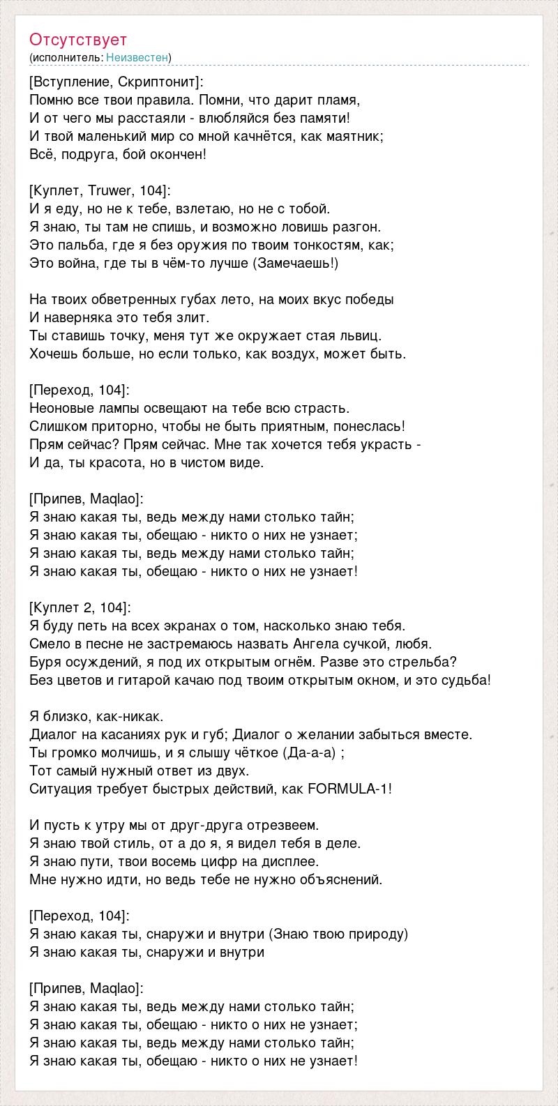 [Вступление, Скриптонит]: Помню все твои правила. Помни, что дарит пламя, И от чего мы расстаяли - влюбляйся без памяти! И твой маленький мир со мной качнётся, как маятник; Всё, подруга, бой окончен! [Куплет, Truwer, 104]: И я еду, но не к тебе, взлетаю, но не с тобой. Я знаю, ты там не спишь, и возможно ловишь разгон. Это пальба, где я без оружия по твоим тонкостям, как; Это война, где ты в чём-то лучше (Замечаешь!) На твоих обветренных губах лето, на моих вкус победы И наверняка это тебя злит. Ты ставишь точку, меня тут же окружает стая львиц. Хочешь больше, но если только, как воздух, может быть. [Переход, 104]: Неоновые лампы освещают на тебе всю страсть. Слишком приторно, чтобы не быть приятным, понеслась! Прям сейчас? Прям сейчас. Мне так хочется тебя украсть - И да, ты красота, но в чистом виде. [Припев, Maqlao]: Я знаю какая ты, ведь между нами столько тайн; Я знаю какая ты, обещаю - никто о них не узнает; Я знаю какая ты, ведь между нами столько тайн; Я знаю какая ты, обещаю - никто о них не узнает! [Куплет 2, 104]: Я буду петь на всех экранах о том, насколько знаю тебя. Смело в песне не застремаюсь назвать Ангела сучкой, любя. Буря осуждений, я под их открытым огнём. Разве это стрельба? Без цветов и гитарой качаю под твоим открытым окном, и это судьба! Я близко, как-никак. Диалог на касаниях рук и губ; Диалог о желании забыться вместе. Ты громко молчишь, и я слышу чёткое (Да-а-а) ; Тот самый нужный ответ из двух. Ситуация требует быстрых действий, как FORMULA-1! И пусть к утру мы от друг-друга отрезвеем. Я знаю твой стиль, от а до я, я видел тебя в деле. Я знаю пути, твои восемь цифр на дисплее. Мне нужно идти, но ведь тебе не нужно объяснений. [Переход, 104]: Я знаю какая ты, снаружи и внутри (Знаю твою природу) Я знаю какая ты, снаружи и внутри [Припев, Maqlao]: Я знаю какая ты, ведь между нами столько тайн; Я знаю какая ты, обещаю - никто о них не узнает; Я знаю какая ты, ведь между нами столько тайн; Я знаю какая ты, обещаю - никто о них не узнает!