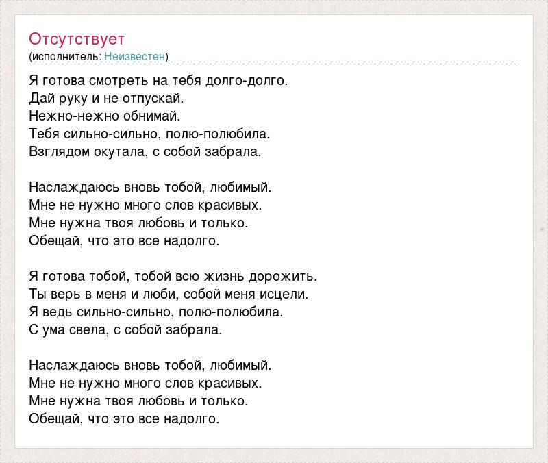 Я готова смотреть на тебя долго-долго. Дай руку и не отпускай. Нежно-нежно обнимай. Тебя сильно-сильно, полю-полюбила. Взглядом окутала, с собой забрала. Наслаждаюсь вновь тобой, любимый. Мне не нужно много слов красивых. Мне нужна твоя любовь и только. Обещай, что это все надолго. Я готова тобой, тобой всю жизнь дорожить. Ты верь в меня и люби, собой меня исцели. Я ведь сильно-сильно, полю-полюбила. С ума свела, с собой забрала. Наслаждаюсь вновь тобой, любимый. Мне не нужно много слов красивых. Мне нужна твоя любовь и только. Обещай, что это все надолго.