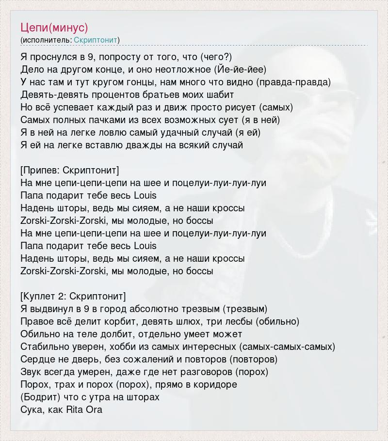 Я проснулся в 9, попросту от того, что (чего?) Дело на другом конце, и оно неотложное (Йе-йе-йее) У нас там и тут кругом гонцы, нам много что видно (правда-правда) Девять-девять процентов братьев моих шабит Но всё успевает каждый раз и движ просто рисует (самых) Самых полных пачками из всех возможных сует (я в ней) Я в ней на легке ловлю самый удачный случай (я ей) Я ей на легке вставлю дважды на всякий случай [Припев: Скриптонит] На мне цепи-цепи-цепи на шее и поцелуи-луи-луи-луи Папа подарит тебе весь Louis Надень шторы, ведь мы сияем, а не наши кроссы Zorski-Zorski-Zorski, мы молодые, но боссы На мне цепи-цепи-цепи на шее и поцелуи-луи-луи-луи Папа подарит тебе весь Louis Надень шторы, ведь мы сияем, а не наши кроссы Zorski-Zorski-Zorski, мы молодые, но боссы [Куплет 2: Скриптонит] Я выдвинул в 9 в город абсолютно трезвым (трезвым) Правое всё делит корбит, девять шлюх, три лесбы (обильно) Обильно на теле долбит, отдельно умеет может Стабильно уверен, хобби из самых интересных (самых-самых-самых) Сердце не дверь, без сожалений и повторов (повторов) Звук всегда умерен, даже где нет разговоров (порох) Порох, трах и порох (порох), прямо в коридоре (Бодрит) что с утра на шторах Сука, как Rita Ora