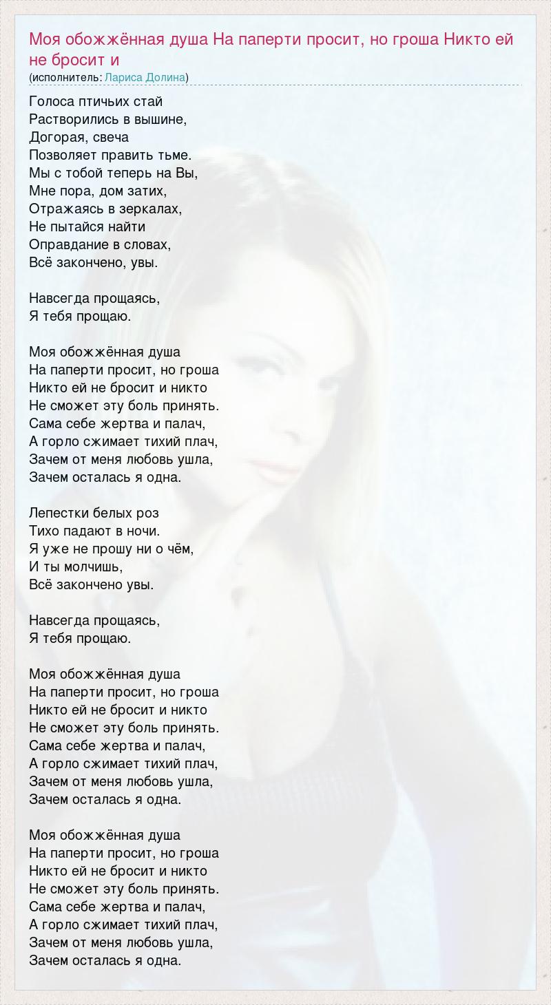 Голоса птичьих стай Растворились в вышине, Догорая, свеча Позволяет править тьме. Мы с тобой теперь на Вы, Мне пора, дом затих, Отражаясь в зеркалах, Не пытайся найти Оправдание в словах, Всё закончено, увы. Навсегда прощаясь, Я тебя прощаю. Моя обожжённая душа На паперти просит, но гроша Никто ей не бросит и никто Не сможет эту боль принять. Сама себе жертва и палач, А горло сжимает тихий плач, Зачем от меня любовь ушла, Зачем осталась я одна. Лепестки белых роз Тихо падают в ночи. Я уже не прошу ни о чём, И ты молчишь, Всё закончено увы. Навсегда прощаясь, Я тебя прощаю. Моя обожжённая душа На паперти просит, но гроша Никто ей не бросит и никто Не сможет эту боль принять. Сама себе жертва и палач, А горло сжимает тихий плач, Зачем от меня любовь ушла, Зачем осталась я одна. Моя обожжённая душа На паперти просит, но гроша Никто ей не бросит и никто Не сможет эту боль принять. Сама себе жертва и палач, А горло сжимает тихий плач, Зачем от меня любовь ушла, Зачем осталась я одна.