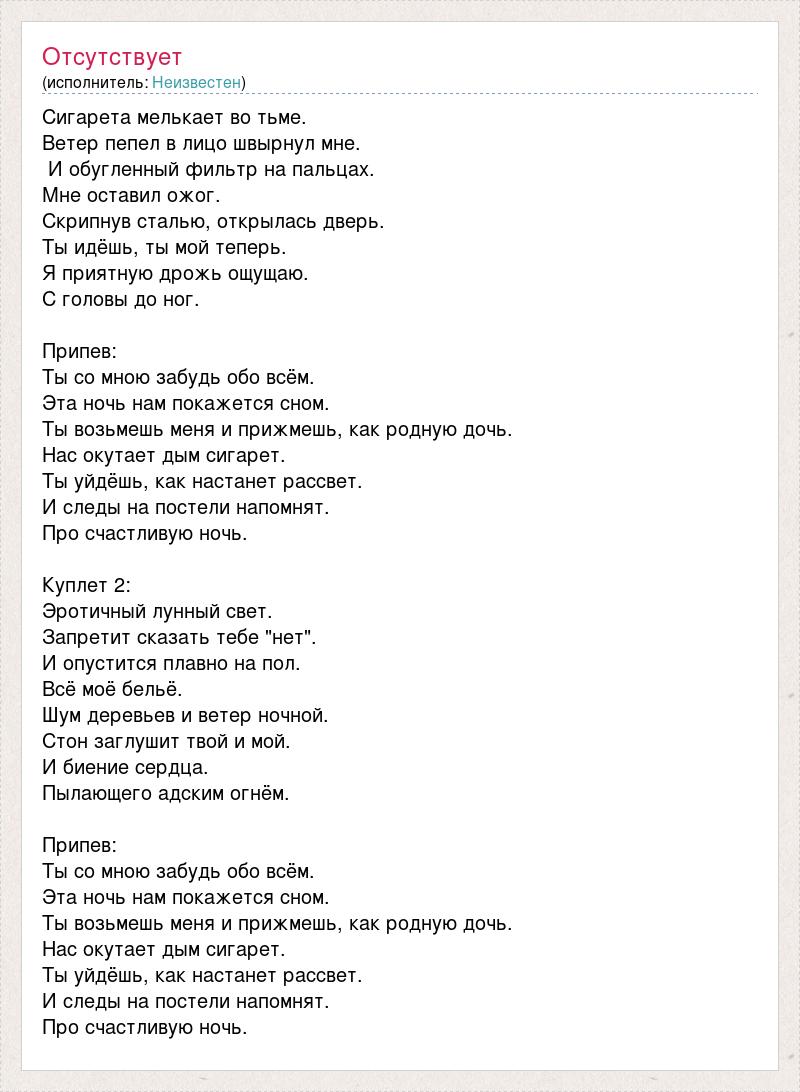 Сигарета мелькает во тьме. Ветер пепел в лицо швырнул мне. И обугленный фильтр на пальцах. Мне оставил ожог. Скрипнув сталью, открылась дверь. Ты идёшь, ты мой теперь. Я приятную дрожь ощущаю. С головы до ног. Припев: Ты со мною забудь обо всём. Эта ночь нам покажется сном. Ты возьмешь меня и прижмешь, как родную дочь. Нас окутает дым сигарет. Ты уйдёшь, как настанет рассвет. И следы на постели напомнят. Про счастливую ночь. Куплет 2: Эротичный лунный свет. Запретит сказать тебе "нет". И опустится плавно на пол. Всё моё бельё. Шум деревьев и ветер ночной. Стон заглушит твой и мой. И биение сердца. Пылающего адским огнём. Припев: Ты со мною забудь обо всём. Эта ночь нам покажется сном. Ты возьмешь меня и прижмешь, как родную дочь. Нас окутает дым сигарет. Ты уйдёшь, как настанет рассвет. И следы на постели напомнят. Про счастливую ночь.