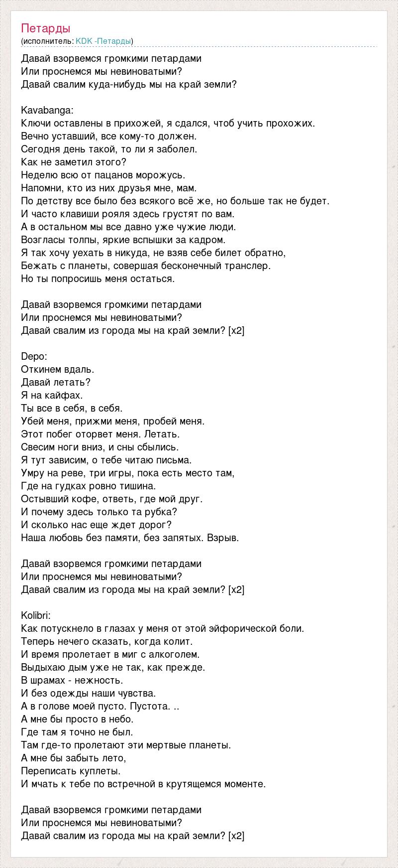 Давай взорвемся громкими петардами Или проснемся мы невиноватыми? Давай свалим куда-нибудь мы на край земли? Kavabanga: Ключи оставлены в прихожей, я сдался, чтоб учить прохожих. Вечно уставший, все кому-то должен. Сегодня день такой, то ли я заболел. Как не заметил этого? Неделю всю от пацанов морожусь. Напомни, кто из них друзья мне, мам. По детству все было без всякого всё же, но больше так не будет. И часто клавиши рояля здесь грустят по вам. А в остальном мы все давно уже чужие люди. Возгласы толпы, яркие вспышки за кадром. Я так хочу уехать в никуда, не взяв себе билет обратно, Бежать с планеты, совершая бесконечный транслер. Но ты попросишь меня остаться. Давай взорвемся громкими петардами Или проснемся мы невиноватыми? Давай свалим из города мы на край земли? [x2] Depo: Откинем вдаль. Давай летать? Я на кайфах. Ты все в себя, в себя. Убей меня, прижми меня, пробей меня. Этот побег оторвет меня. Летать. Свесим ноги вниз, и сны сбылись. Я тут зависим, о тебе читаю письма. Умру на реве, три игры, пока есть место там, Где на гудках ровно тишина. Остывший кофе, ответь, где мой друг. И почему здесь только та рубка? И сколько нас еще ждет дорог? Наша любовь без памяти, без запятых. Взрыв. Давай взорвемся громкими петардами Или проснемся мы невиноватыми? Давай свалим из города мы на край земли? [x2] Kolibri: Как потускнело в глазах у меня от этой эйфорической боли. Теперь нечего сказать, когда колит. И время пролетает в миг с алкоголем. Выдыхаю дым уже не так, как прежде. В шрамах - нежность. И без одежды наши чувства. А в голове моей пусто. Пустота. .. А мне бы просто в небо. Где там я точно не был. Там где-то пролетают эти мертвые планеты. А мне бы забыть лето, Переписать куплеты. И мчать к тебе по встречной в крутящемся моменте. Давай взорвемся громкими петардами Или проснемся мы невиноватыми? Давай свалим из города мы на край земли? [x2]