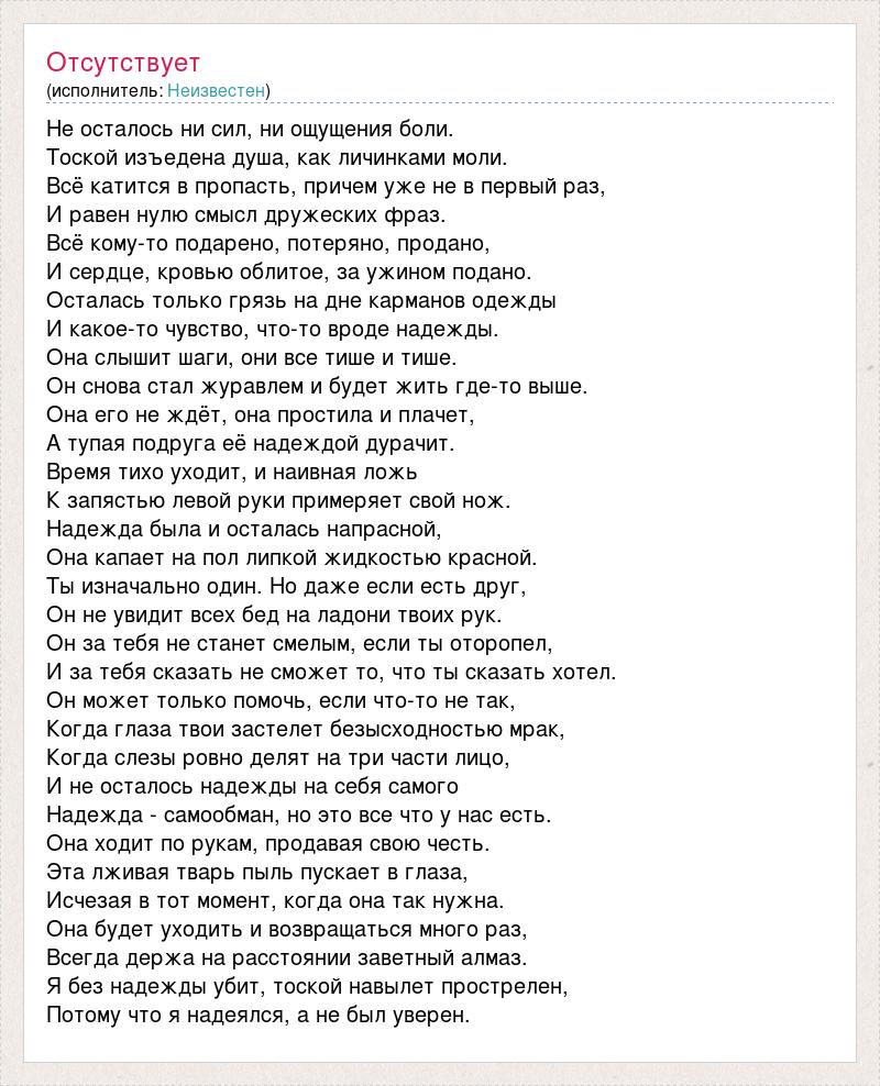 Не осталось ни сил, ни ощущения боли. Тоской изъедена душа, как личинками моли. Всё катится в пропасть, причем уже не в первый раз, И равен нулю смысл дружеских фраз. Всё кому-то подарено, потеряно, продано, И сердце, кровью облитое, за ужином подано. Осталась только грязь на дне карманов одежды И какое-то чувство, что-то вроде надежды. Она слышит шаги, они все тише и тише. Он снова стал журавлем и будет жить где-то выше. Она его не ждёт, она простила и плачет, А тупая подруга её надеждой дурачит. Время тихо уходит, и наивная ложь К запястью левой руки примеряет свой нож. Надежда была и осталась напрасной, Она капает на пол липкой жидкостью красной. Ты изначально один. Но даже если есть друг, Он не увидит всех бед на ладони твоих рук. Он за тебя не станет смелым, если ты оторопел, И за тебя сказать не сможет то, что ты сказать хотел. Он может только помочь, если что-то не так, Когда глаза твои застелет безысходностью мрак, Когда слезы ровно делят на три части лицо, И не осталось надежды на себя самого Надежда - самообман, но это все что у нас есть. Она ходит по рукам, продавая свою честь. Эта лживая тварь пыль пускает в глаза, Исчезая в тот момент, когда она так нужна. Она будет уходить и возвращаться много раз, Всегда держа на расстоянии заветный алмаз. Я без надежды убит, тоской навылет прострелен, Потому что я надеялся, а не был уверен.