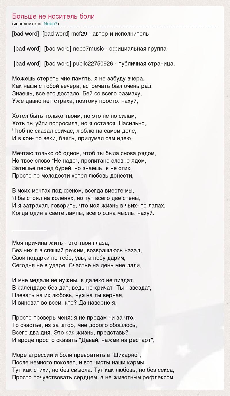 [bad word] [bad word] mcf29 - автор и исполнитель [bad word] [bad word] nebo7music - официальная группа [bad word] [bad word] public22750926 - публичная страница. Можешь стереть мне память, я не забуду вчера, Как наши с тобой вечера, встречать был очень рад, Знаешь, все это достало. Бей со всего размаху, Уже давно нет страха, поэтому просто: нахуй, Хотел быть только твоим, но это не по силам, Хоть ты уйти попросила, но я остался. Насильно, Чтоб не сказал сейчас, люблю на самом деле, И в кои- то веки, блять, придумал сам идею, Мечтаю только об одном, чтоб ты была снова рядом, Но твое слово "Не надо", пропитано словно ядом, Затишье перед бурей, но знаешь, я не стих, Просто по молодости хотел любовь донести, В моих мечтах под феном, всегда вместе мы, Я бы стоял на коленях, но тут всего две стены, И я затрахал, говорить, что моя жизнь в чьих- то лапах, Когда один в свете лампы, всего одна мысль: нахуй. ___________ Моя причина жить - это твои глаза, Без них я в спящий режим, возвращаюсь назад, Свои подарки не тебе, увы, а небу дарим, Сегодня не в ударе. Счастье на день мне дали, И мне медали не нужны, я далеко не пиздат, В календаре без дат, ведь не кричат "Ты - звезда", Плевать на их любовь, нужна ты верная, И виноват во всем, кто? Да наверно я. Просто проверь меня: я не предам ни за что, То счастье, из за штор, мне дорого обошлось, Всего два дня. Это как жизнь, представь?, И вроде просто сказать "Давай, нажми на рестарт", Море агрессии и боли превратить в "Шикарно", После немного поколет, и вот чисты наши кармы, Тут как стихи, но без смысла. Тут как любовь, но без секса, Просто почувствовать сердцем, а не животным рефлексом.