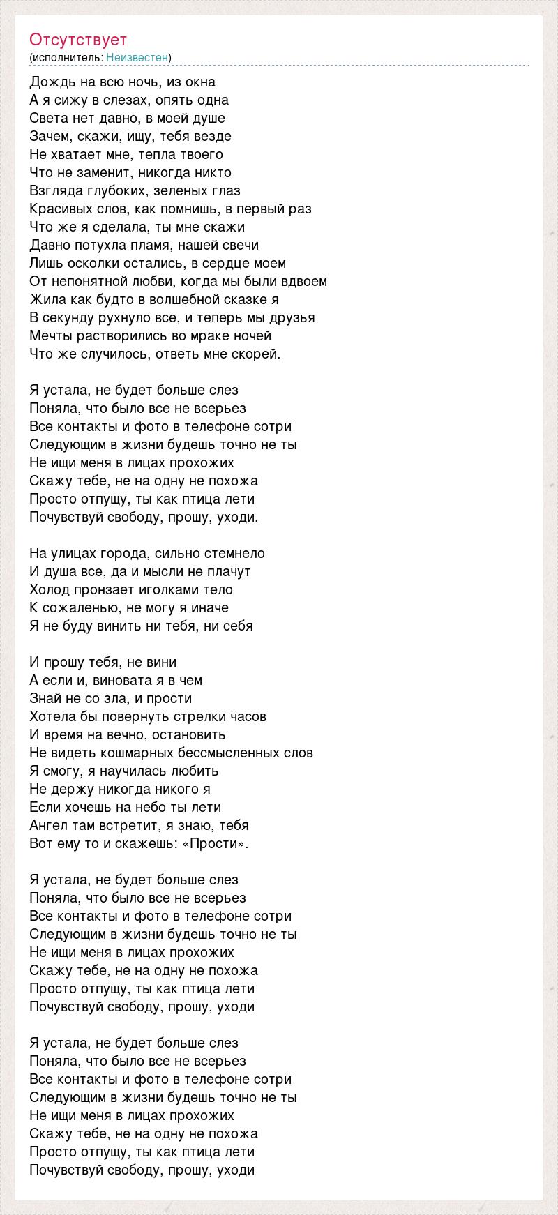 Дождь на всю ночь, из окна А я сижу в слезах, опять одна Света нет давно, в моей душе Зачем, скажи, ищу, тебя везде Не хватает мне, тепла твоего Что не заменит, никогда никто Взгляда глубоких, зеленых глаз Красивых слов, как помнишь, в первый раз Что же я сделала, ты мне скажи Давно потухла пламя, нашей свечи Лишь осколки остались, в сердце моем От непонятной любви, когда мы были вдвоем Жила как будто в волшебной сказке я В секунду рухнуло все, и теперь мы друзья Мечты растворились во мраке ночей Что же случилось, ответь мне скорей. Я устала, не будет больше слез Поняла, что было все не всерьез Все контакты и фото в телефоне сотри Следующим в жизни будешь точно не ты Не ищи меня в лицах прохожих Скажу тебе, не на одну не похожа Просто отпущу, ты как птица лети Почувствуй свободу, прошу, уходи. На улицах города, сильно стемнело И душа все, да и мысли не плачут Холод пронзает иголками тело К сожаленью, не могу я иначе Я не буду винить ни тебя, ни себя И прошу тебя, не вини А если и, виновата я в чем Знай не со зла, и прости Хотела бы повернуть стрелки часов И время на вечно, остановить Не видеть кошмарных бессмысленных слов Я смогу, я научилась любить Не держу никогда никого я Если хочешь на небо ты лети Ангел там встретит, я знаю, тебя Вот ему то и скажешь: «Прости». Я устала, не будет больше слез Поняла, что было все не всерьез Все контакты и фото в телефоне сотри Следующим в жизни будешь точно не ты Не ищи меня в лицах прохожих Скажу тебе, не на одну не похожа Просто отпущу, ты как птица лети Почувствуй свободу, прошу, уходи Я устала, не будет больше слез Поняла, что было все не всерьез Все контакты и фото в телефоне сотри Следующим в жизни будешь точно не ты Не ищи меня в лицах прохожих Скажу тебе, не на одну не похожа Просто отпущу, ты как птица лети Почувствуй свободу, прошу, уходи