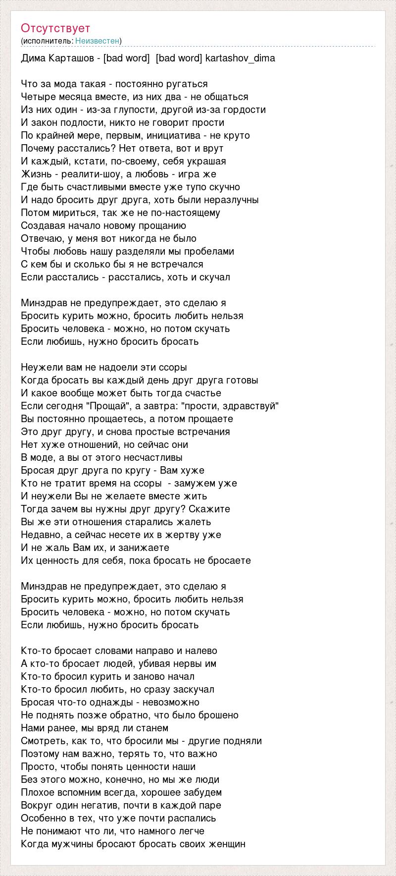 Дима Карташов - [bad word] [bad word] kartashov_dima Что за мода такая - постоянно ругаться Четыре месяца вместе, из них два - не общаться Из них один - из-за глупости, другой из-за гордости И закон подлости, никто не говорит прости По крайней мере, первым, инициатива - не круто Почему расстались? Нет ответа, вот и врут И каждый, кстати, по-своему, себя украшая Жизнь - реалити-шоу, а любовь - игра же Где быть счастливыми вместе уже тупо скучно И надо бросить друг друга, хоть были неразлучны Потом мириться, так же не по-настоящему Создавая начало новому прощанию Отвечаю, у меня вот никогда не было Чтобы любовь нашу разделяли мы пробелами С кем бы и сколько бы я не встречался Если расстались - расстались, хоть и скучал Минздрав не предупреждает, это сделаю я Бросить курить можно, бросить любить нельзя Бросить человека - можно, но потом скучать Если любишь, нужно бросить бросать Неужели вам не надоели эти ссоры Когда бросать вы каждый день друг друга готовы И какое вообще может быть тогда счастье Если сегодня "Прощай", а завтра: "прости, здравствуй" Вы постоянно прощаетесь, а потом прощаете Это друг другу, и снова простые встречания Нет хуже отношений, но сейчас они В моде, а вы от этого несчастливы Бросая друг друга по кругу - Вам хуже Кто не тратит время на ссоры - замужем уже И неужели Вы не желаете вместе жить Тогда зачем вы нужны друг другу? Скажите Вы же эти отношения старались жалеть Недавно, а сейчас несете их в жертву уже И не жаль Вам их, и занижаете Их ценность для себя, пока бросать не бросаете Минздрав не предупреждает, это сделаю я Бросить курить можно, бросить любить нельзя Бросить человека - можно, но потом скучать Если любишь, нужно бросить бросать Кто-то бросает словами направо и налево А кто-то бросает людей, убивая нервы им Кто-то бросил курить и заново начал Кто-то бросил любить, но сразу заскучал Бросая что-то однажды - невозможно Не поднять позже обратно, что было брошено Нами ранее, мы вряд ли станем Смотреть, как то, что бросили мы - другие подняли Поэтому нам важно, терять то, что важно Просто, чтобы понять ценности наши Без этого можно, конечно, но мы же люди Плохое вспомним всегда, хорошее забудем Вокруг один негатив, почти в каждой паре Особенно в тех, что уже почти распались Не понимают что ли, что намного легче Когда мужчины бросают бросать своих женщин