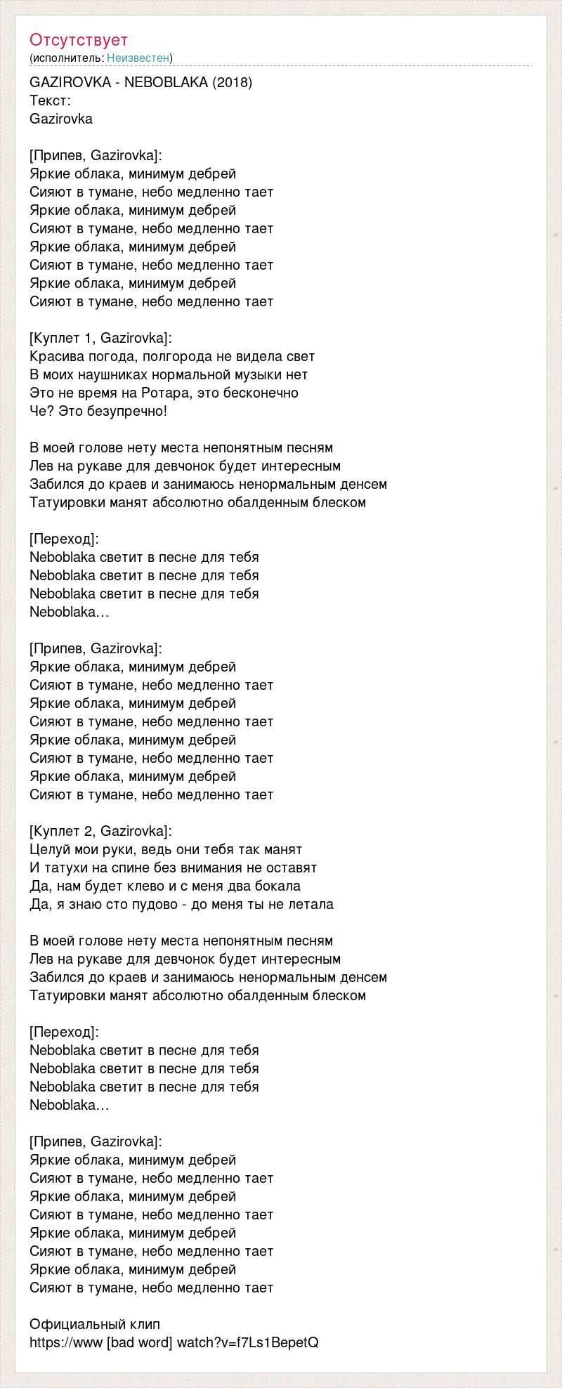 GAZIROVKA - NEBOBLAKA (2018) Текст: Gazirovka [Припев, Gazirovka]: Яркие облака, минимум дебрей Сияют в тумане, небо медленно тает Яркие облака, минимум дебрей Сияют в тумане, небо медленно тает Яркие облака, минимум дебрей Сияют в тумане, небо медленно тает Яркие облака, минимум дебрей Сияют в тумане, небо медленно тает [Куплет 1, Gazirovka]: Красива погода, полгорода не видела свет В моих наушниках нормальной музыки нет Это не время на Ротара, это бесконечно Че? Это безупречно! В моей голове нету места непонятным песням Лев на рукаве для девчонок будет интересным Забился до краев и занимаюсь ненормальным денсем Татуировки манят абсолютно обалденным блеском [Переход]: Neboblaka светит в песне для тебя Neboblaka светит в песне для тебя Neboblaka светит в песне для тебя Neboblaka… [Припев, Gazirovka]: Яркие облака, минимум дебрей Сияют в тумане, небо медленно тает Яркие облака, минимум дебрей Сияют в тумане, небо медленно тает Яркие облака, минимум дебрей Сияют в тумане, небо медленно тает Яркие облака, минимум дебрей Сияют в тумане, небо медленно тает [Куплет 2, Gazirovka]: Целуй мои руки, ведь они тебя так манят И татухи на спине без внимания не оставят Да, нам будет клево и с меня два бокала Да, я знаю сто пудово - до меня ты не летала В моей голове нету места непонятным песням Лев на рукаве для девчонок будет интересным Забился до краев и занимаюсь ненормальным денсем Татуировки манят абсолютно обалденным блеском [Переход]: Neboblaka светит в песне для тебя Neboblaka светит в песне для тебя Neboblaka светит в песне для тебя Neboblaka… [Припев, Gazirovka]: Яркие облака, минимум дебрей Сияют в тумане, небо медленно тает Яркие облака, минимум дебрей Сияют в тумане, небо медленно тает Яркие облака, минимум дебрей Сияют в тумане, небо медленно тает Яркие облака, минимум дебрей Сияют в тумане, небо медленно тает Официальный клип https://www [bad word] watch?v=f7Ls1BepetQ