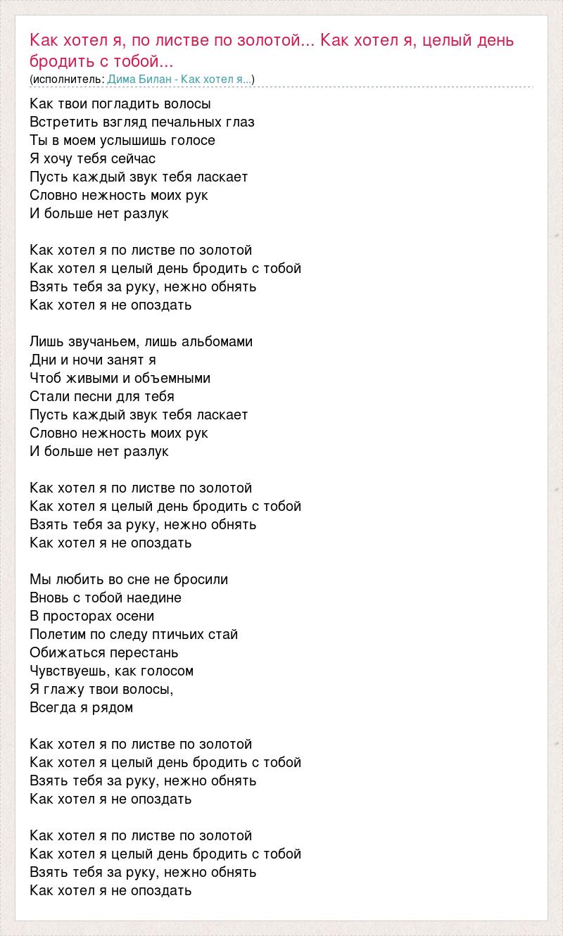 Как твои погладить волосы Встретить взгляд печальных глаз Ты в моем услышишь голосе Я хочу тебя сейчас Пусть каждый звук тебя ласкает Словно нежность моих рук И больше нет разлук Как хотел я по листве по золотой Как хотел я целый день бродить с тобой Взять тебя за руку, нежно обнять Как хотел я не опоздать Лишь звучаньем, лишь альбомами Дни и ночи занят я Чтоб живыми и объемными Стали песни для тебя Пусть каждый звук тебя ласкает Словно нежность моих рук И больше нет разлук Как хотел я по листве по золотой Как хотел я целый день бродить с тобой Взять тебя за руку, нежно обнять Как хотел я не опоздать Мы любить во сне не бросили Вновь с тобой наедине В просторах осени Полетим по следу птичьих стай Обижаться перестань Чувствуешь, как голосом Я глажу твои волосы, Всегда я рядом Как хотел я по листве по золотой Как хотел я целый день бродить с тобой Взять тебя за руку, нежно обнять Как хотел я не опоздать Как хотел я по листве по золотой Как хотел я целый день бродить с тобой Взять тебя за руку, нежно обнять Как хотел я не опоздать