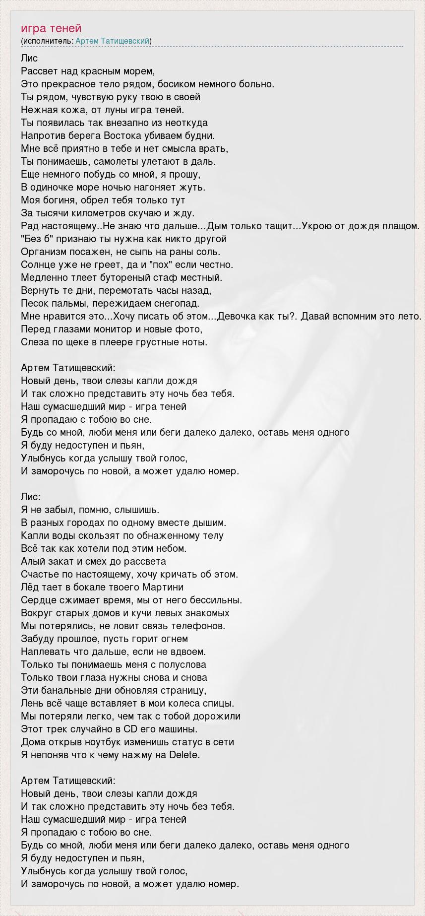 Лис Рассвет над красным морем, Это прекрасное тело рядом, босиком немного больно. Ты рядом, чувствую руку твою в своей Нежная кожа, от луны игра теней. Ты появилась так внезапно из неоткуда Напротив берега Востока убиваем будни. Мне всё приятно в тебе и нет смысла врать, Ты понимаешь, самолеты улетают в даль. Еще немного побудь со мной, я прошу, В одиночке море ночью нагоняет жуть. Моя богиня, обрел тебя только тут За тысячи километров скучаю и жду. Рад настоящему..Не знаю что дальше...Дым только тащит...Укрою от дождя плащом. "Без б" признаю ты нужна как никто другой Организм посажен, не сыпь на раны соль. Солнце уже не греет, да и "пох" если честно. Медленно тлеет бутореный стаф местный. Вернуть те дни, перемотать часы назад, Песок пальмы, пережидаем снегопад. Мне нравится это...Хочу писать об этом...Девочка как ты?. Давай вспомним это лето. Перед глазами монитор и новые фото, Слеза по щеке в плеере грустные ноты. Артем Татищевский: Новый день, твои слезы капли дождя И так сложно представить эту ночь без тебя. Наш сумасшедший мир - игра теней Я пропадаю с тобою во сне. Будь со мной, люби меня или беги далеко далеко, оставь меня одного Я буду недоступен и пьян, Улыбнусь когда услышу твой голос, И заморочусь по новой, а может удалю номер. Лис: Я не забыл, помню, слышишь. В разных городах по одному вместе дышим. Капли воды скользят по обнаженному телу Всё так как хотели под этим небом. Алый закат и смех до рассвета Счастье по настоящему, хочу кричать об этом. Лёд тает в бокале твоего Мартини Сердце сжимает время, мы от него бессильны. Вокруг старых домов и кучи левых знакомых Мы потерялись, не ловит связь телефонов. Забуду прошлое, пусть горит огнем Наплевать что дальше, если не вдвоем. Только ты понимаешь меня с полуслова Только твои глаза нужны снова и снова Эти банальные дни обновляя страницу, Лень всё чаще вставляет в мои колеса спицы. Мы потеряли легко, чем так с тобой дорожили Этот трек случайно в CD его машины. Дома открыв ноутбук изменишь статус в сети Я непоняв что к чему нажму на Delete. Артем Татищевский: Новый день, твои слезы капли дождя И так сложно представить эту ночь без тебя. Наш сумасшедший мир - игра теней Я пропадаю с тобою во сне. Будь со мной, люби меня или беги далеко далеко, оставь меня одного Я буду недоступен и пьян, Улыбнусь когда услышу твой голос, И заморочусь по новой, а может удалю номер.