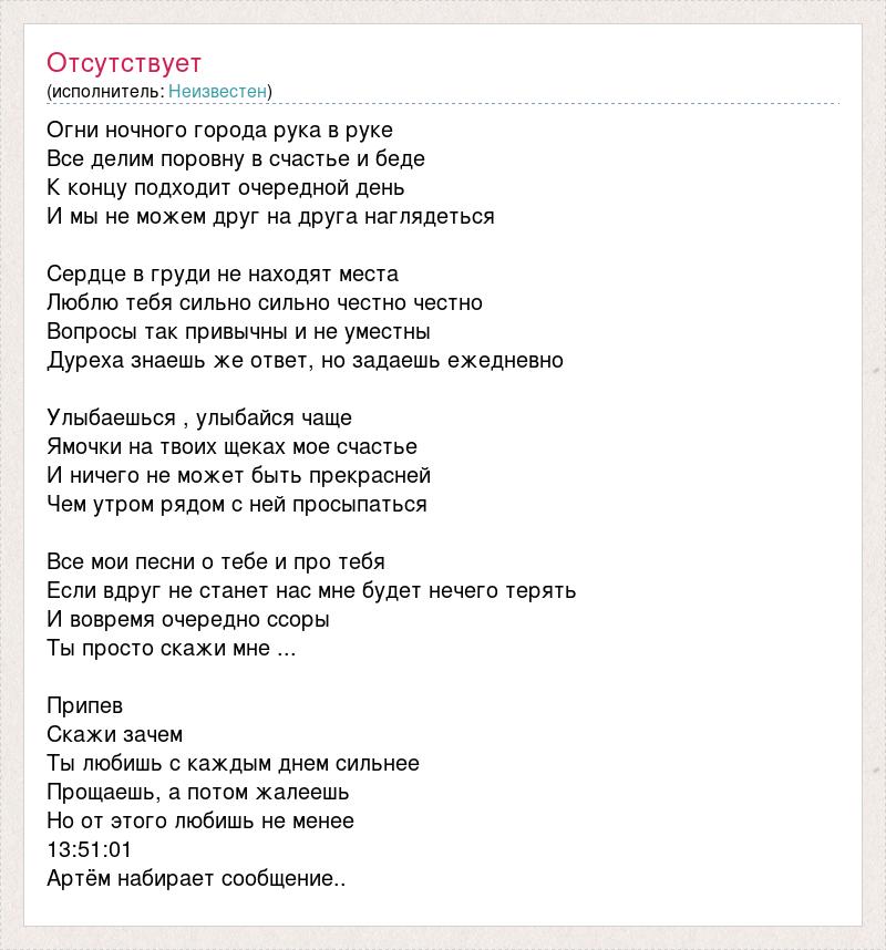 Огни ночного города рука в руке Все делим поровну в счастье и беде К концу подходит очередной день И мы не можем друг на друга наглядеться Сердце в груди не находят места Люблю тебя сильно сильно честно честно Вопросы так привычны и не уместны Дуреха знаешь же ответ, но задаешь ежедневно Улыбаешься , улыбайся чаще Ямочки на твоих щеках мое счастье И ничего не может быть прекрасней Чем утром рядом с ней просыпаться Все мои песни о тебе и про тебя Если вдруг не станет нас мне будет нечего терять И вовремя очередно ссоры Ты просто скажи мне ... Припев Скажи зачем Ты любишь с каждым днем сильнее Прощаешь, а потом жалеешь Но от этого любишь не менее 13:51:01 Артём набирает сообщение..