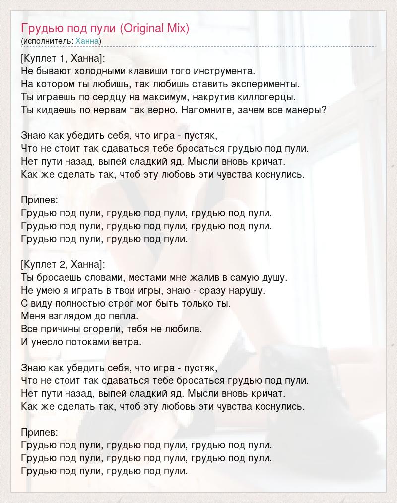 [Куплет 1, Ханна]: Не бывают холодными клавиши того инструмента. На котором ты любишь, так любишь ставить эксперименты. Ты играешь по сердцу на максимум, накрутив киллогерцы. Ты кидаешь по нервам так верно. Напомните, зачем все манеры? Знаю как убедить себя, что игра - пустяк, Что не стоит так сдаваться тебе бросаться грудью под пули. Нет пути назад, выпей сладкий яд. Мысли вновь кричат. Как же сделать так, чтоб эту любовь эти чувства коснулись. Припев: Грудью под пули, грудью под пули, грудью под пули. Грудью под пули, грудью под пули, грудью под пули. Грудью под пули, грудью под пули. [Куплет 2, Ханна]: Ты бросаешь словами, местами мне жалив в самую душу. Не умею я играть в твои игры, знаю - сразу нарушу. С виду полностью строг мог быть только ты. Меня взглядом до пепла. Все причины сгорели, тебя не любила. И унесло потоками ветра. Знаю как убедить себя, что игра - пустяк, Что не стоит так сдаваться тебе бросаться грудью под пули. Нет пути назад, выпей сладкий яд. Мысли вновь кричат. Как же сделать так, чтоб эту любовь эти чувства коснулись. Припев: Грудью под пули, грудью под пули, грудью под пули. Грудью под пули, грудью под пули, грудью под пули. Грудью под пули, грудью под пули.