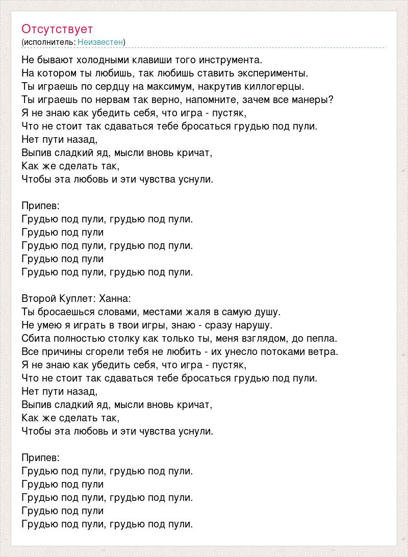 Не бывают холодными клавиши того инструмента. На котором ты любишь, так любишь ставить эксперименты. Ты играешь по сердцу на максимум, накрутив киллогерцы. Ты играешь по нервам так верно, напомните, зачем все манеры? Я не знаю как убедить себя, что игра - пустяк, Что не стоит так сдаваться тебе бросаться грудью под пули. Нет пути назад, Выпив сладкий яд, мысли вновь кричат, Как же сделать так, Чтобы эта любовь и эти чувства уснули. Припев: Грудью под пули, грудью под пули. Грудью под пули Грудью под пули, грудью под пули. Грудью под пули Грудью под пули, грудью под пули. Второй Куплет: Ханна: Ты бросаешься словами, местами жаля в самую душу. Не умею я играть в твои игры, знаю - сразу нарушу. Сбита полностью столку как только ты, меня взглядом, до пепла. Все причины сгорели тебя не любить - их унесло потоками ветра. Я не знаю как убедить себя, что игра - пустяк, Что не стоит так сдаваться тебе бросаться грудью под пули. Нет пути назад, Выпив сладкий яд, мысли вновь кричат, Как же сделать так, Чтобы эта любовь и эти чувства уснули. Припев: Грудью под пули, грудью под пули. Грудью под пули Грудью под пули, грудью под пули. Грудью под пули Грудью под пули, грудью под пули.