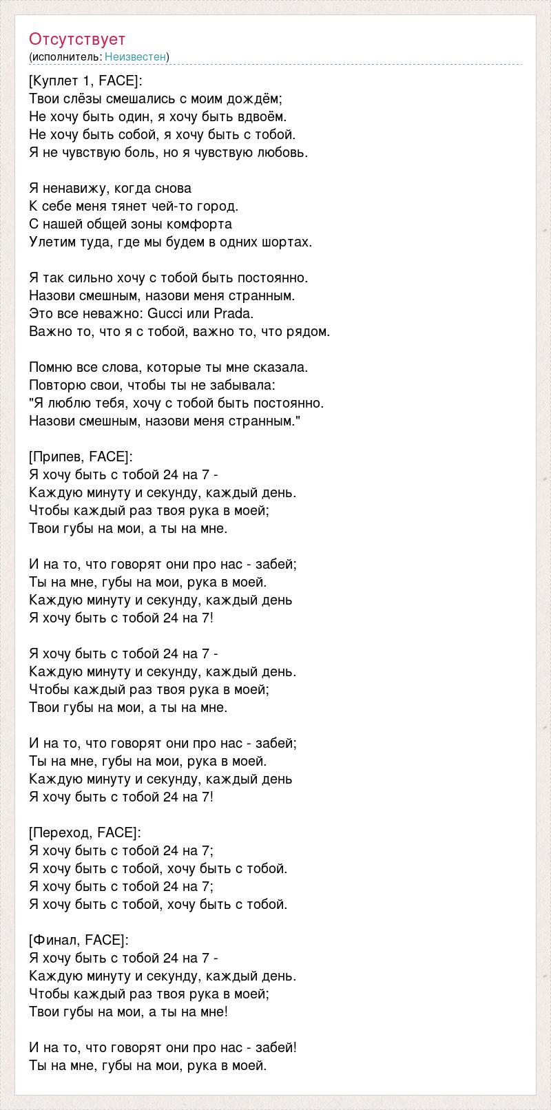 [Куплет 1, FACE]: Твои слёзы смешались с моим дождём; Не хочу быть один, я хочу быть вдвоём. Не хочу быть собой, я хочу быть с тобой. Я не чувствую боль, но я чувствую любовь. Я ненавижу, когда снова К себе меня тянет чей-то город. С нашей общей зоны комфорта Улетим туда, где мы будем в одних шортах. Я так сильно хочу с тобой быть постоянно. Назови смешным, назови меня странным. Это все неважно: Gucci или Prada. Важно то, что я с тобой, важно то, что рядом. Помню все слова, которые ты мне сказала. Повторю свои, чтобы ты не забывала: "Я люблю тебя, хочу с тобой быть постоянно. Назови смешным, назови меня странным." [Припев, FACE]: Я хочу быть с тобой 24 на 7 - Каждую минуту и секунду, каждый день. Чтобы каждый раз твоя рука в моей; Твои губы на мои, а ты на мне. И на то, что говорят они про нас - забей; Ты на мне, губы на мои, рука в моей. Каждую минуту и секунду, каждый день Я хочу быть с тобой 24 на 7! Я хочу быть с тобой 24 на 7 - Каждую минуту и секунду, каждый день. Чтобы каждый раз твоя рука в моей; Твои губы на мои, а ты на мне. И на то, что говорят они про нас - забей; Ты на мне, губы на мои, рука в моей. Каждую минуту и секунду, каждый день Я хочу быть с тобой 24 на 7! [Переход, FACE]: Я хочу быть с тобой 24 на 7; Я хочу быть с тобой, хочу быть с тобой. Я хочу быть с тобой 24 на 7; Я хочу быть с тобой, хочу быть с тобой. [Финал, FACE]: Я хочу быть с тобой 24 на 7 - Каждую минуту и секунду, каждый день. Чтобы каждый раз твоя рука в моей; Твои губы на мои, а ты на мне! И на то, что говорят они про нас - забей! Ты на мне, губы на мои, рука в моей.