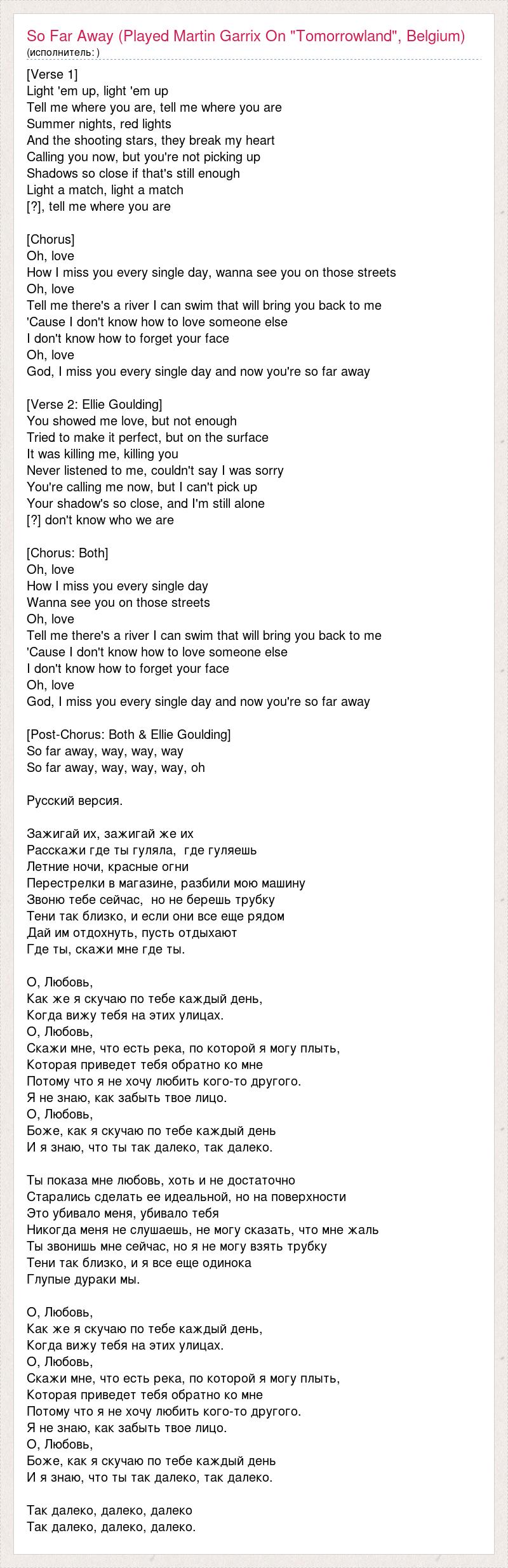 [Verse 1] Light 'em up, light 'em up Tell me where you are, tell me where you are Summer nights, red lights And the shooting stars, they break my heart Calling you now, but you're not picking up Shadows so close if that's still enough Light a match, light a match [?], tell me where you are [Chorus] Oh, love How I miss you every single day, wanna see you on those streets Oh, love Tell me there's a river I can swim that will bring you back to me 'Cause I don't know how to love someone else I don't know how to forget your face Oh, love God, I miss you every single day and now you're so far away [Verse 2: Ellie Goulding] You showed me love, but not enough Tried to make it perfect, but on the surface It was killing me, killing you Never listened to me, couldn't say I was sorry You're calling me now, but I can't pick up Your shadow's so close, and I'm still alone [?] don't know who we are [Chorus: Both] Oh, love How I miss you every single day Wanna see you on those streets Oh, love Tell me there's a river I can swim that will bring you back to me 'Cause I don't know how to love someone else I don't know how to forget your face Oh, love God, I miss you every single day and now you're so far away [Post-Chorus: Both & Ellie Goulding] So far away, way, way, way So far away, way, way, way, oh Русский версия. Зажигай их, зажигай же их Расскажи где ты гуляла, где гуляешь Летние ночи, красные огни Перестрелки в магазине, разбили мою машину Звоню тебе сейчас, но не берешь трубку Тени так близко, и если они все еще рядом Дай им отдохнуть, пусть отдыхают Где ты, скажи мне где ты. О, Любовь, Как же я скучаю по тебе каждый день, Когда вижу тебя на этих улицах. О, Любовь, Скажи мне, что есть река, по которой я могу плыть, Которая приведет тебя обратно ко мне Потому что я не хочу любить кого-то другого. Я не знаю, как забыть твое лицо. О, Любовь, Боже, как я скучаю по тебе каждый день И я знаю, что ты так далеко, так далеко. Ты показа мне любовь, хоть и не достаточно Старались сделать ее идеальной, но на поверхности Это убивало меня, убивало тебя Никогда меня не слушаешь, не могу сказать, что мне жаль Ты звонишь мне сейчас, но я не могу взять трубку Тени так близко, и я все еще одинока Глупые дураки мы. О, Любовь, Как же я скучаю по тебе каждый день, Когда вижу тебя на этих улицах. О, Любовь, Скажи мне, что есть река, по которой я могу плыть, Которая приведет тебя обратно ко мне Потому что я не хочу любить кого-то другого. Я не знаю, как забыть твое лицо. О, Любовь, Боже, как я скучаю по тебе каждый день И я знаю, что ты так далеко, так далеко. Так далеко, далеко, далеко Так далеко, далеко, далеко.
