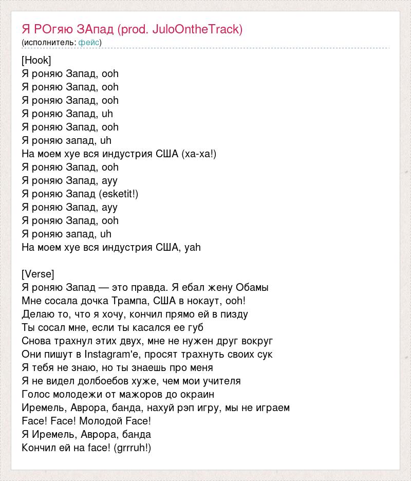 [Hook] Я роняю Запад, ooh Я роняю Запад, ooh Я роняю Запад, ooh Я роняю Запад, uh Я роняю Запад, ooh Я роняю запад, uh На моем хуе вся индустрия США (ха-ха!) Я роняю Запад, ooh Я роняю Запад, ayy Я роняю Запад (esketit!) Я роняю Запад, ayy Я роняю Запад, ooh Я роняю запад, uh На моем хуе вся индустрия США, yah [Verse] Я роняю Запад — это правда. Я ебал жену Обамы Мне сосала дочка Трампа, США в нокаут, ooh! Делаю то, что я хочу, кончил прямо ей в пизду Ты сосал мне, если ты касался ее губ Снова трахнул этих двух, мне не нужен друг вокруг Они пишут в Instagram'е, просят трахнуть своих сук Я тебя не знаю, но ты знаешь про меня Я не видел долбоебов хуже, чем мои учителя Голос молодежи от мажоров до окраин Иремель, Аврора, банда, нахуй рэп игру, мы не играем Face! Face! Молодой Face! Я Иремель, Аврора, банда Кончил ей на face! (grrruh!)