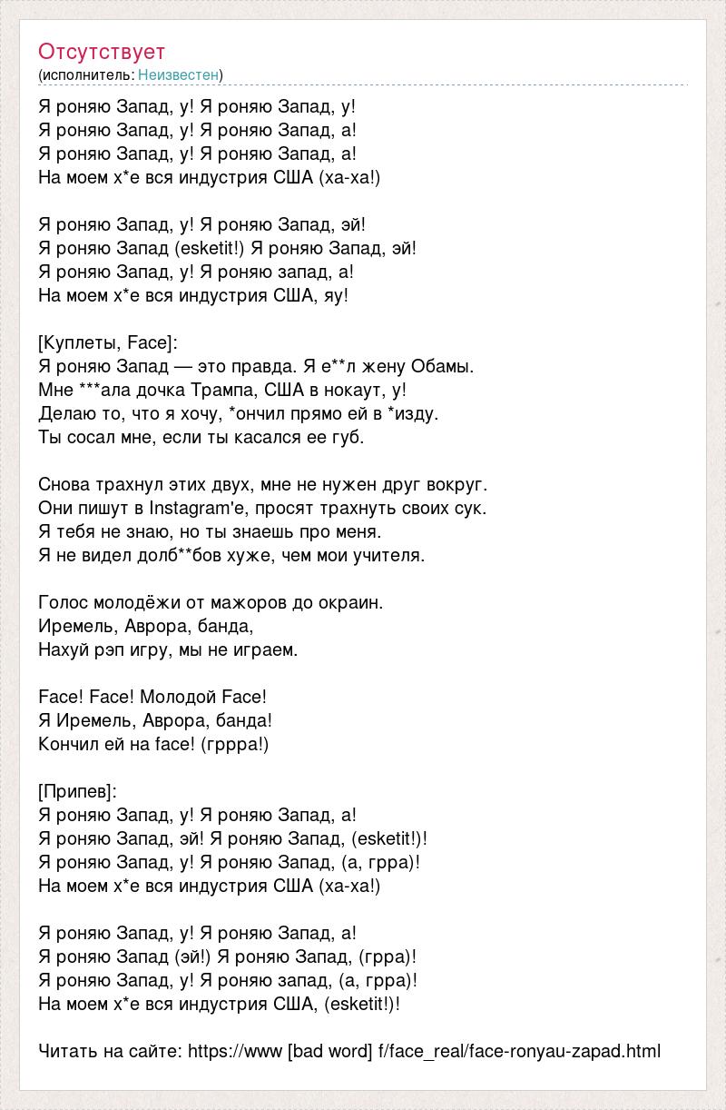 Я роняю Запад, у! Я роняю Запад, у! Я роняю Запад, у! Я роняю Запад, а! Я роняю Запад, у! Я роняю Запад, а! На моем х*е вся индустрия США (ха-ха!) Я роняю Запад, у! Я роняю Запад, эй! Я роняю Запад (esketit!) Я роняю Запад, эй! Я роняю Запад, у! Я роняю запад, а! На моем х*е вся индустрия США, яу! [Куплеты, Face]: Я роняю Запад — это правда. Я е**л жену Обамы. Мне ***ала дочка Трампа, США в нокаут, у! Делаю то, что я хочу, *ончил прямо ей в *изду. Ты сосал мне, если ты касался ее губ. Снова трахнул этих двух, мне не нужен друг вокруг. Они пишут в Instagram'е, просят трахнуть своих сук. Я тебя не знаю, но ты знаешь про меня. Я не видел долб**бов хуже, чем мои учителя. Голос молодёжи от мажоров до окраин. Иремель, Аврора, банда, Нахуй рэп игру, мы не играем. Face! Face! Молодой Face! Я Иремель, Аврора, банда! Кончил ей на face! (гррра!) [Припев]: Я роняю Запад, у! Я роняю Запад, а! Я роняю Запад, эй! Я роняю Запад, (esketit!)! Я роняю Запад, у! Я роняю Запад, (а, грра)! На моем х*е вся индустрия США (ха-ха!) Я роняю Запад, у! Я роняю Запад, а! Я роняю Запад (эй!) Я роняю Запад, (грра)! Я роняю Запад, у! Я роняю запад, (а, грра)! На моем х*е вся индустрия США, (esketit!)! Читать на сайте: https://www [bad word] f/face_real/face-ronyau-zapad.html