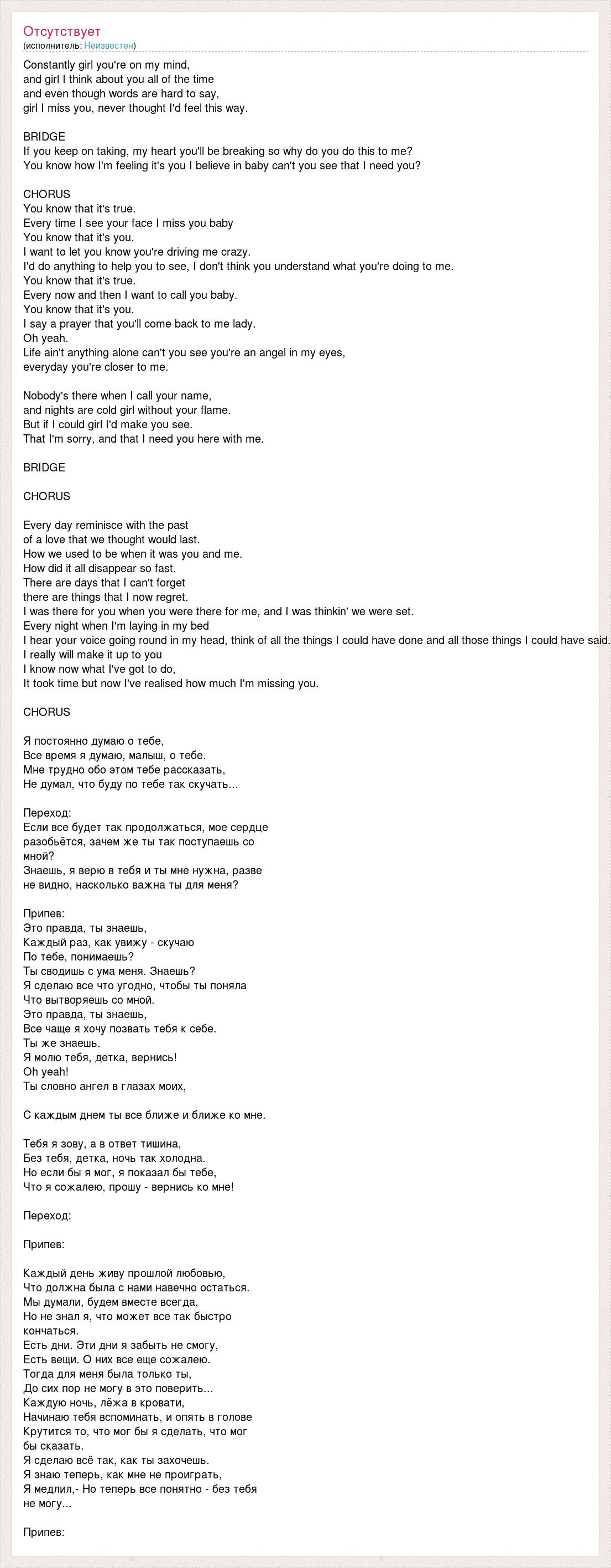 Constantly girl you're on my mind, and girl I think about you all of the time and even though words are hard to say, girl I miss you, never thought I'd feel this way. BRIDGE If you keep on taking, my heart you'll be breaking so why do you do this to me? You know how I'm feeling it's you I believe in baby can't you see that I need you? CHORUS You know that it's true. Every time I see your face I miss you baby You know that it's you. I want to let you know you're driving me crazy. I'd do anything to help you to see, I don't think you understand what you're doing to me. You know that it's true. Every now and then I want to call you baby. You know that it's you. I say a prayer that you'll come back to me lady. Oh yeah. Life ain't anything alone can't you see you're an angel in my eyes, everyday you're closer to me. Nobody's there when I call your name, and nights are cold girl without your flame. But if I could girl I'd make you see. That I'm sorry, and that I need you here with me. BRIDGE CHORUS Every day reminisce with the past of a love that we thought would last. How we used to be when it was you and me. How did it all disappear so fast. There are days that I can't forget there are things that I now regret. I was there for you when you were there for me, and I was thinkin' we were set. Every night when I'm laying in my bed I hear your voice going round in my head, think of all the things I could have done and all those things I could have said. I really will make it up to you I know now what I've got to do, It took time but now I've realised how much I'm missing you. CHORUS Я постоянно думаю о тебе, Все время я думаю, малыш, о тебе. Мне трудно обо этом тебе рассказать, Не думал, что буду по тебе так скучать... Переход: Если все будет так продолжаться, мое сердце разобьётся, зачем же ты так поступаешь со мной? Знаешь, я верю в тебя и ты мне нужна, разве не видно, насколько важна ты для меня? Припев: Это правда, ты знаешь, Каждый раз, как увижу - скучаю По тебе, понимаешь? Ты сводишь с ума меня. Знаешь? Я сделаю все что угодно, чтобы ты поняла Что вытворяешь со мной. Это правда, ты знаешь, Все чаще я хочу позвать тебя к себе. Ты же знаешь. Я молю тебя, детка, вернись! Oh yeah! Ты словно ангел в глазах моих, С каждым днем ты все ближе и ближе ко мне. Тебя я зову, а в ответ тишина, Без тебя, детка, ночь так холодна. Но если бы я мог, я показал бы тебе, Что я сожалею, прошу - вернись ко мне! Переход: Припев: Каждый день живу прошлой любовью, Что должна была с нами навечно остаться. Мы думали, будем вместе всегда, Но не знал я, что может все так быстро кончаться. Есть дни. Эти дни я забыть не смогу, Есть вещи. О них все еще сожалею. Тогда для меня была только ты, До сих пор не могу в это поверить... Каждую ночь, лёжа в кровати, Начинаю тебя вспоминать, и опять в голове Крутится то, что мог бы я сделать, что мог бы сказать. Я сделаю всё так, как ты захочешь. Я знаю теперь, как мне не проиграть, Я медлил,- Но теперь все понятно - без тебя не могу... Припев: