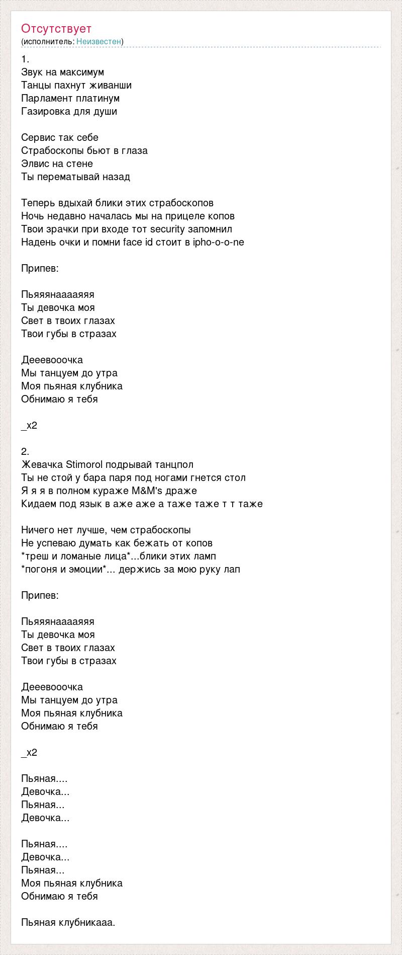 1. Звук на максимум Танцы пахнут живанши Парламент платинум Газировка для души Сервис так себе Страбоскопы бьют в глаза Элвис на стене Ты перематывай назад Теперь вдыхай блики этих страбоскопов Ночь недавно началась мы на прицеле копов Твои зрачки при входе тот security запомнил Надень очки и помни face id стоит в ipho-o-o-nе Припев: Пьяяянааааяяя Ты девочка моя Свет в твоих глазах Твои губы в стразах Дееевооочка Мы танцуем до утра Моя пьяная клубника Обнимаю я тебя _х2 2. Жевачка Stimorol подрывай танцпол Ты не стой у бара паря под ногами гнется стол Я я я в полном кураже M&M's драже Кидаем под язык в аже аже а таже таже т т таже Ничего нет лучше, чем страбоскопы Не успеваю думать как бежать от копов *треш и ломаные лица*...блики этих ламп *погоня и эмоции*... держись за мою руку лап Припев: Пьяяянааааяяя Ты девочка моя Свет в твоих глазах Твои губы в стразах Дееевооочка Мы танцуем до утра Моя пьяная клубника Обнимаю я тебя _х2 Пьяная.... Девочка... Пьяная... Девочка... Пьяная.... Девочка... Пьяная... Моя пьяная клубника Обнимаю я тебя Пьяная клубникааа.