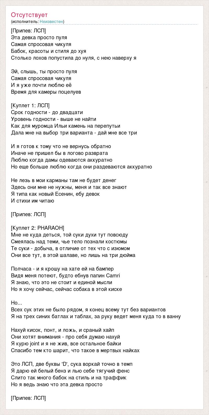 [Припев: ЛСП] Эта девка просто пуля Самая спросовая чикуля Бабок, красоты и стиля до хуя Столько лохов попустила до нуля, с нею наверху я Эй, слышь, ты просто пуля Самая спросовая чикуля И я уже почти люблю её Время для камеры поцелуев [Куплет 1: ЛСП] Срок годности - до двадцати Уровень годности - выше не найти Как для муромца Ильи камень на перепутьи Дала мне на выбор три варианта - дай мне все три И я готов к тому что не вернусь обратно Иначе не пришел бы в логово разврата Люблю когда дамы одеваются аккуратно Но еще больше люблю когда они раздеваются аккуратно Не лезь в мои карманы там не будет денег Здесь они мне не нужны, меня и так все знают Я типа как новый Есенин, ебу девок И стихи им читаю [Припев: ЛСП] [Куплет 2: PHARAOH] Мне не куда деться, той суки духи тут повсюду Смеялась над теми, чье тело познали костюмы Те суки - добыча, в отличие от тех что с изюмом Они все тут, в этой шалаве, но лишь на три дюйма Полчаса - и я крошу на хате ей на бампер Видя меня потеют, будто ебнув папин Camri Я знаю, что это не стоит и единой мысли Но я хочу сейчас, сейчас собака в этой киске Но... Всех сук этих не было рядом, я конец всему тут без вариантов Я на трех синих батлах и таблах, за руку ведет меня куда то в ванну Нахуй кисок, понт, и ложь, и сраный хайп Они хотят внимания - про себя думаю нахуй Я курю joint и я не жив, все остальное байки Спасибо тем кто шарит, что такое в мертвых найках Это ЛСП, две буквы 'D', сука воркай точно в темп Я дарю ей белый бенз и лью себе тягучий фенс Слито так много бабок на стиль и на траффик Но я ведь знаю что эта девка просто [Припев: ЛСП]