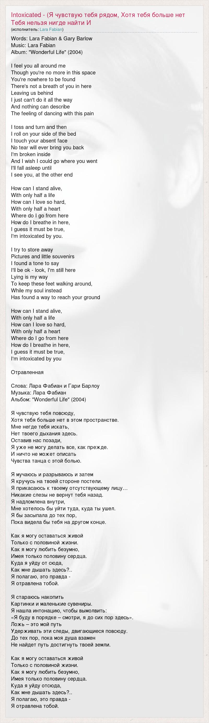 Words: Lara Fabian & Gary Barlow Music: Lara Fabian Album: "Wonderful Life" (2004) I feel you all around me Though you're no more in this space You're nowhere to be found There's not a breath of you in here Leaving us behind I just can't do it all the way And nothing can describe The feeling of dancing with this pain I toss and turn and then I roll on your side of the bed I touch your absent face No tear will ever bring you back I'm broken inside And I wish I could go where you went I'll fall asleep until I see you, at the other end How can I stand alive, With only half a life How can I love so hard, With only half a heart Where do I go from here How do I breathe in here, I guess it must be true, I'm intoxicated by you. I try to store away Pictures and little souvenirs I found a tone to say I'll be ok - look, I'm still here Lying is my way To keep these feet walking around, While my soul instead Has found a way to reach your ground How can I stand alive, With only half a life How can I love so hard, With only half a heart Where do I go from here How do I breathe in here, I guess it must be true, I'm intoxicated by you Отравленная Слова: Лара Фабиан и Гари Барлоу Музыка: Лара Фабиан Альбом: "Wonderful Life" (2004) Я чувствую тебя повсюду, Хотя тебя больше нет в этом пространстве. Мне негде тебя искать, Нет твоего дыхания здесь. Оставив нас позади, Я уже не могу делать все, как прежде. И ничто не может описать Чувства танца с этой болью. Я мучаюсь и разрываюсь и затем Я кручусь на твоей стороне постели. Я прикасаюсь к твоему отсутствующему лицу… Никакие слезы не вернут тебя назад. Я надломлена внутри, Мне хотелось бы уйти туда, куда ты ушел. Я бы засыпала до тех пор, Пока видела бы тебя на другом конце. Как я могу оставаться живой Только с половиной жизни. Как я могу любить безумно, Имея только половину сердца. Куда я уйду от сюда, Как мне дышать здесь?.. Я полагаю, это правда - Я отравлена тобой. Я стараюсь накопить Картинки и маленькие сувениры. Я нашла интонацию, чтобы вымолвить: «Я буду в порядке – смотри, я до сих пор здесь». Ложь – это мой путь Удерживать эти следы, двигающиеся повсюду. До тех пор, пока моя душа взамен Не найдет путь достигнуть твоей земли. Как я могу оставаться живой Только с половиной жизни. Как я могу любить безумно, Имея только половину сердца. Куда я уйду отсюда, Как мне дышать здесь?.. Я полагаю, это правда - Я отравлена тобой.