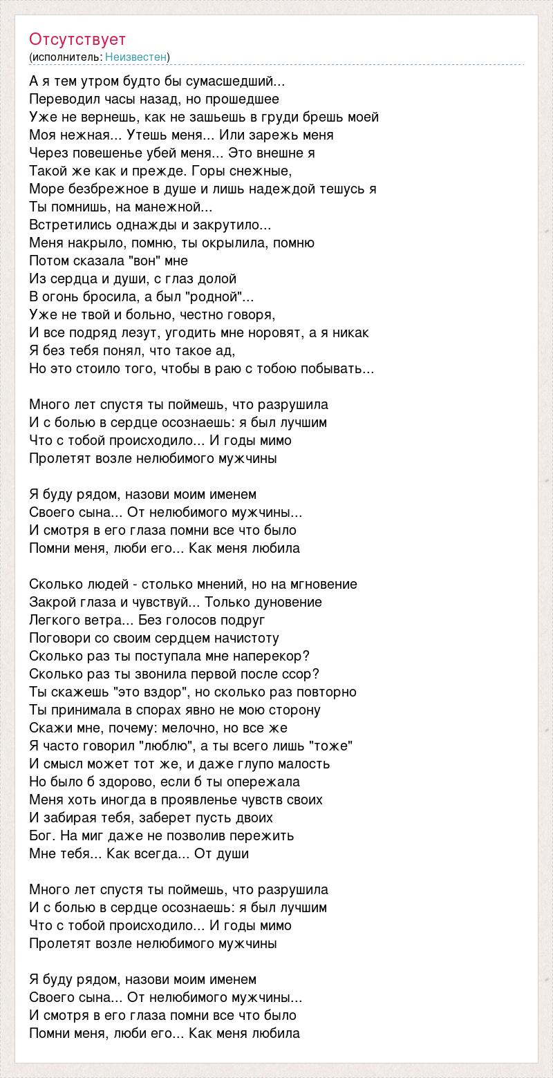 А я тем утром будто бы сумасшедший... Переводил часы назад, но прошедшее Уже не вернешь, как не зашьешь в груди брешь моей Моя нежная... Утешь меня... Или зарежь меня Через повешенье убей меня... Это внешне я Такой же как и прежде. Горы снежные, Море безбрежное в душе и лишь надеждой тешусь я Ты помнишь, на манежной... Встретились однажды и закрутило... Меня накрыло, помню, ты окрылила, помню Потом сказала "вон" мне Из сердца и души, с глаз долой В огонь бросила, а был "родной"... Уже не твой и больно, честно говоря, И все подряд лезут, угодить мне норовят, а я никак Я без тебя понял, что такое ад, Но это стоило того, чтобы в раю с тобою побывать... Много лет спустя ты поймешь, что разрушила И с болью в сердце осознаешь: я был лучшим Что с тобой происходило... И годы мимо Пролетят возле нелюбимого мужчины Я буду рядом, назови моим именем Своего сына... От нелюбимого мужчины... И смотря в его глаза помни все что было Помни меня, люби его... Как меня любила Сколько людей - столько мнений, но на мгновение Закрой глаза и чувствуй... Только дуновение Легкого ветра... Без голосов подруг Поговори со своим сердцем начистоту Сколько раз ты поступала мне наперекор? Сколько раз ты звонила первой после ссор? Ты скажешь "это вздор", но сколько раз повторно Ты принимала в спорах явно не мою сторону Скажи мне, почему: мелочно, но все же Я часто говорил "люблю", а ты всего лишь "тоже" И смысл может тот же, и даже глупо малость Но было б здорово, если б ты опережала Меня хоть иногда в проявленье чувств своих И забирая тебя, заберет пусть двоих Бог. На миг даже не позволив пережить Мне тебя... Как всегда... От души Много лет спустя ты поймешь, что разрушила И с болью в сердце осознаешь: я был лучшим Что с тобой происходило... И годы мимо Пролетят возле нелюбимого мужчины Я буду рядом, назови моим именем Своего сына... От нелюбимого мужчины... И смотря в его глаза помни все что было Помни меня, люби его... Как меня любила