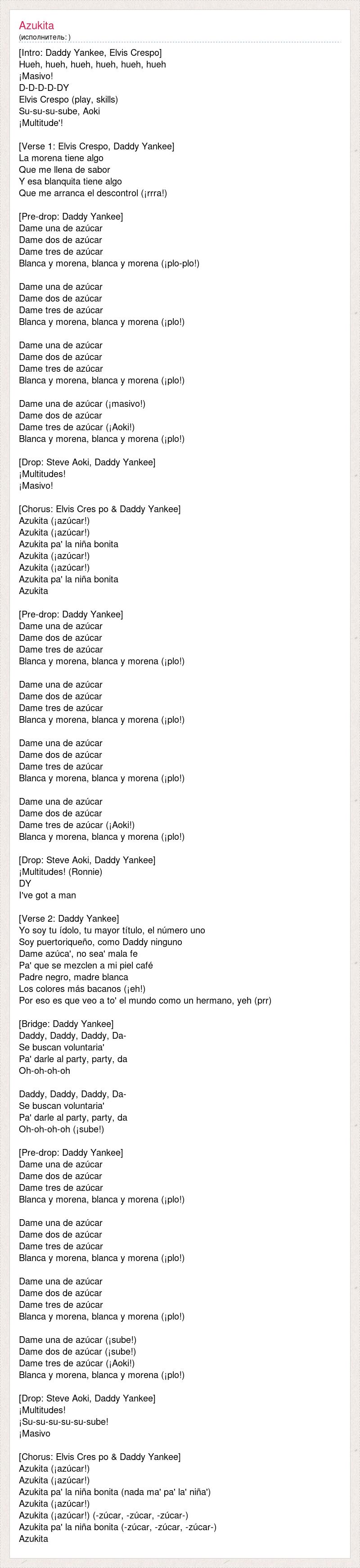 [Intro: Daddy Yankee, Elvis Crespo] Hueh, hueh, hueh, hueh, hueh, hueh ¡Masivo! D-D-D-D-DY Elvis Crespo (play, skills) Su-su-su-sube, Aoki ¡Multitude'! [Verse 1: Elvis Crespo, Daddy Yankee] La morena tiene algo Que me llena de sabor Y esa blanquita tiene algo Que me arranca el descontrol (¡rrra!) [Pre-drop: Daddy Yankee] Dame una de azúcar Dame dos de azúcar Dame tres de azúcar Blanca y morena, blanca y morena (¡plo-plo!) Dame una de azúcar Dame dos de azúcar Dame tres de azúcar Blanca y morena, blanca y morena (¡plo!) Dame una de azúcar Dame dos de azúcar Dame tres de azúcar Blanca y morena, blanca y morena (¡plo!) Dame una de azúcar (¡masivo!) Dame dos de azúcar Dame tres de azúcar (¡Aoki!) Blanca y morena, blanca y morena (¡plo!) [Drop: Steve Aoki, Daddy Yankee] ¡Multitudes! ¡Masivo! [Chorus: Elvis Cres po & Daddy Yankee] Azukita (¡azúcar!) Azukita (¡azúcar!) Azukita pa' la niña bonita Azukita (¡azúcar!) Azukita (¡azúcar!) Azukita pa' la niña bonita Azukita [Pre-drop: Daddy Yankee] Dame una de azúcar Dame dos de azúcar Dame tres de azúcar Blanca y morena, blanca y morena (¡plo!) Dame una de azúcar Dame dos de azúcar Dame tres de azúcar Blanca y morena, blanca y morena (¡plo!) Dame una de azúcar Dame dos de azúcar Dame tres de azúcar Blanca y morena, blanca y morena (¡plo!) Dame una de azúcar Dame dos de azúcar Dame tres de azúcar (¡Aoki!) Blanca y morena, blanca y morena (¡plo!) [Drop: Steve Aoki, Daddy Yankee] ¡Multitudes! (Ronnie) DY I've got a man [Verse 2: Daddy Yankee] Yo soy tu ídolo, tu mayor título, el número uno Soy puertoriqueño, como Daddy ninguno Dame azúca', no sea' mala fe Pa' que se mezclen a mi piel café Padre negro, madre blanca Los colores más bacanos (¡eh!) Por eso es que veo a to' el mundo como un hermano, yeh (prr) [Bridge: Daddy Yankee] Daddy, Daddy, Daddy, Da- Se buscan voluntaria' Pa' darle al party, party, da Oh-oh-oh-oh Daddy, Daddy, Daddy, Da- Se buscan voluntaria' Pa' darle al party, party, da Oh-oh-oh-oh (¡sube!) [Pre-drop: Daddy Yankee] Dame una de azúcar Dame dos de azúcar Dame tres de azúcar Blanca y morena, blanca y morena (¡plo!) Dame una de azúcar Dame dos de azúcar Dame tres de azúcar Blanca y morena, blanca y morena (¡plo!) Dame una de azúcar Dame dos de azúcar Dame tres de azúcar Blanca y morena, blanca y morena (¡plo!) Dame una de azúcar (¡sube!) Dame dos de azúcar (¡sube!) Dame tres de azúcar (¡Aoki!) Blanca y morena, blanca y morena (¡plo!) [Drop: Steve Aoki, Daddy Yankee] ¡Multitudes! ¡Su-su-su-su-su-sube! ¡Masivo [Chorus: Elvis Cres po & Daddy Yankee] Azukita (¡azúcar!) Azukita (¡azúcar!) Azukita pa' la niña bonita (nada ma' pa' la' niña') Azukita (¡azúcar!) Azukita (¡azúcar!) (-zúcar, -zúcar, -zúcar-) Azukita pa' la niña bonita (-zúcar, -zúcar, -zúcar-) Azukita
