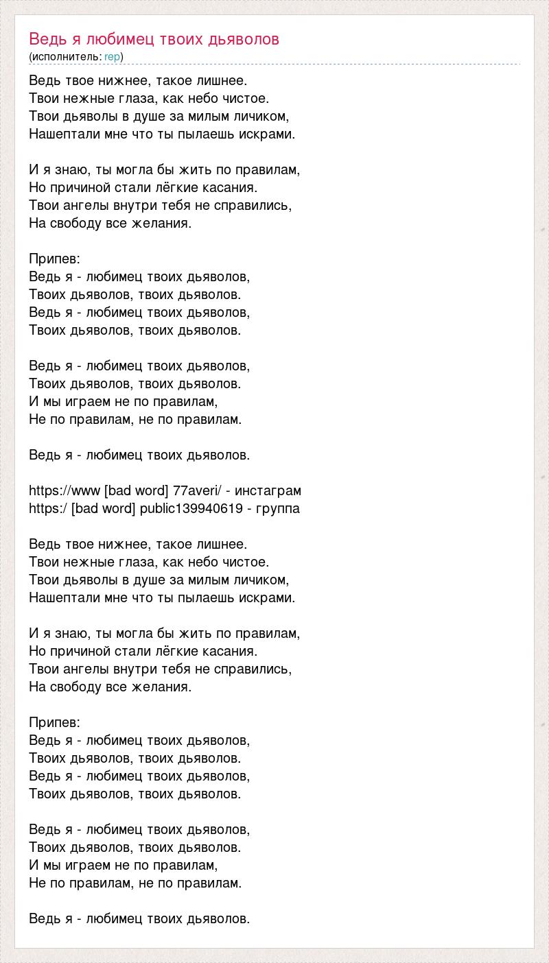Ведь твое нижнее, такое лишнее. Твои нежные глаза, как небо чистое. Твои дьяволы в душе за милым личиком, Нашептали мне что ты пылаешь искрами. И я знаю, ты могла бы жить по правилам, Но причиной стали лёгкие касания. Твои ангелы внутри тебя не справились, На свободу все желания. Припев: Ведь я - любимец твоих дьяволов, Твоих дьяволов, твоих дьяволов. Ведь я - любимец твоих дьяволов, Твоих дьяволов, твоих дьяволов. Ведь я - любимец твоих дьяволов, Твоих дьяволов, твоих дьяволов. И мы играем не по правилам, Не по правилам, не по правилам. Ведь я - любимец твоих дьяволов. https://www [bad word] 77averi/ - инстаграм https:/ [bad word] public139940619 - группа Ведь твое нижнее, такое лишнее. Твои нежные глаза, как небо чистое. Твои дьяволы в душе за милым личиком, Нашептали мне что ты пылаешь искрами. И я знаю, ты могла бы жить по правилам, Но причиной стали лёгкие касания. Твои ангелы внутри тебя не справились, На свободу все желания. Припев: Ведь я - любимец твоих дьяволов, Твоих дьяволов, твоих дьяволов. Ведь я - любимец твоих дьяволов, Твоих дьяволов, твоих дьяволов. Ведь я - любимец твоих дьяволов, Твоих дьяволов, твоих дьяволов. И мы играем не по правилам, Не по правилам, не по правилам. Ведь я - любимец твоих дьяволов.