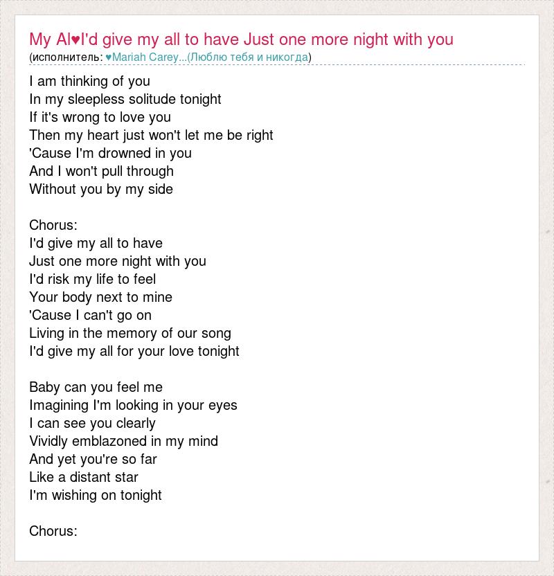I am thinking of you In my sleepless solitude tonight If it's wrong to love you Then my heart just won't let me be right 'Cause I'm drowned in you And I won't pull through Without you by my side Chorus: I'd give my all to have Just one more night with you I'd risk my life to feel Your body next to mine 'Cause I can't go on Living in the memory of our song I'd give my all for your love tonight Baby can you feel me Imagining I'm looking in your eyes I can see you clearly Vividly emblazoned in my mind And yet you're so far Like a distant star I'm wishing on tonight Chorus:
