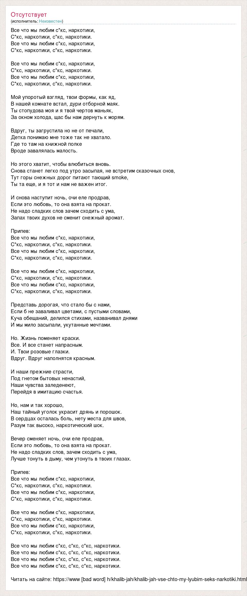 Все что мы любим с*кс, наркотики, С*кс, наркотики, с*кс, наркотики. Все что мы любим с*кс, наркотики, С*кс, наркотики, с*кс, наркотики. Все что мы любим с*кс, наркотики, С*кс, наркотики, с*кс, наркотики. Все что мы любим с*кс, наркотики, С*кс, наркотики, с*кс, наркотики. Мой упоротый взгляд, твои формы, как яд, В нашей комнате встал, дури отборной маяк. Ты стопудова моя и я твой чертов маньяк, За окном холода, щас бы нам дернуть к морям. Вдруг, ты загрустила но не от печали, Детка понимаю мне тоже так не хватало. Где то там на книжной полке Вроде завалялась малость. Но этого хватит, чтобы влюбиться вновь. Снова станет легко под утро засыпая, не встретим сказочных снов, Тут горы снежных дорог питают тающий smoke, Ты та еще, и я тот и нам не важен итог. И снова наступит ночь, очи еле продрав, Если это любовь, то она взята на прокат. Не надо сладких слов зачем сходить с ума, Запах твоих духов не сменит снежный аромат. Припев: Все что мы любим с*кс, наркотики, С*кс, наркотики, с*кс, наркотики. Все что мы любим с*кс, наркотики, С*кс, наркотики, с*кс, наркотики. Все что мы любим с*кс, наркотики, С*кс, наркотики, с*кс, наркотики. Все что мы любим с*кс, наркотики, С*кс, наркотики, с*кс, наркотики. Представь дорогая, что стало бы с нами, Если б не заваливал цветами, с пустыми словами, Куча обещаний, делился стихами, названивал днями И мы мило засыпали, укутанные мечтами. Но. Жизнь поменяет краски. Все. И все станет напрасным. И. Твои розовые глазки. Вдруг. Вдруг наполнятся красным. И наши прежние страсти, Под гнетом бытовых ненастий, Наши чувства заледенеют, Перейдя в имитацию счастья. Но, нам и так хорошо, Наш тайный уголок украсит дрянь и порошок. В сердцах осталась боль, нету места для швов, Разум так высоко, наркотический шок. Вечер сменяет ночь, очи еле продрав, Если это любовь, то она взята на прокат. Не надо сладких слов, зачем сходить с ума, Лучше тонуть в дыму, чем утонуть в твоих глазах. Припев: Все что мы любим с*кс, наркотики, С*кс, наркотики, с*кс, наркотики. Все что мы любим с*кс, наркотики, С*кс, наркотики, с*кс, наркотики. Все что мы любим с*кс, наркотики, С*кс, наркотики, с*кс, наркотики. Все что мы любим с*кс, наркотики, С*кс, наркотики, с*кс, наркотики. Все что мы любим с*кс, с*кс, с*кс, наркотики. Все что мы любим с*кс, с*кс, с*кс, наркотики. Все что мы любим с*кс, с*кс, с*кс, наркотики. Все что мы любим с*кс, с*кс, с*кс, наркотики. Читать на сайте: https://www [bad word] h/khalib-jah/khalib-jah-vse-chto-my-lyubim-seks-narkotiki.html