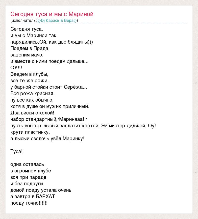 Сегодня туса, и мы с Мариной так нарядились,Ой, как две блядины))) Поедем в Прада, зацепим мачо, и вместе с ними поедем дальше... ОУ!!! Заедем в клубы, все те же рожи, у барной стойки стоит Серёжа... Вся рожа красная, ну все как обычно, хотя в душе он мужик приличный. Два виски с колой! набор стандартный,/Маринааа!!/ пусть вон тот лысый заплатит картой. Эй мистер диджей, Оу! крути пластинку, а лысый сволочь увёл Маринку! Туса! одна осталась в огромном клубе вся при параде и без подруги домой поеду устала очень а завтра в БАРХАТ поеду точно!!!!!!