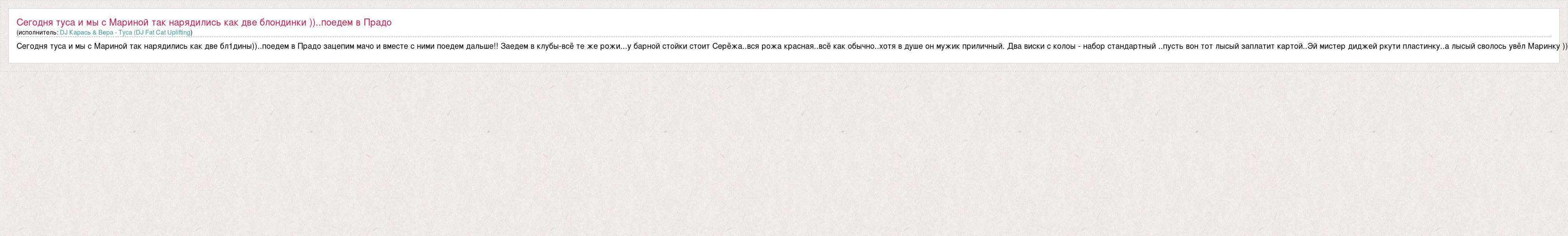Главная→Исполнители→Неизвестен→Сегодня туса и мы с Мариной так нарядились как две бл1дины))..поедем в Прадо