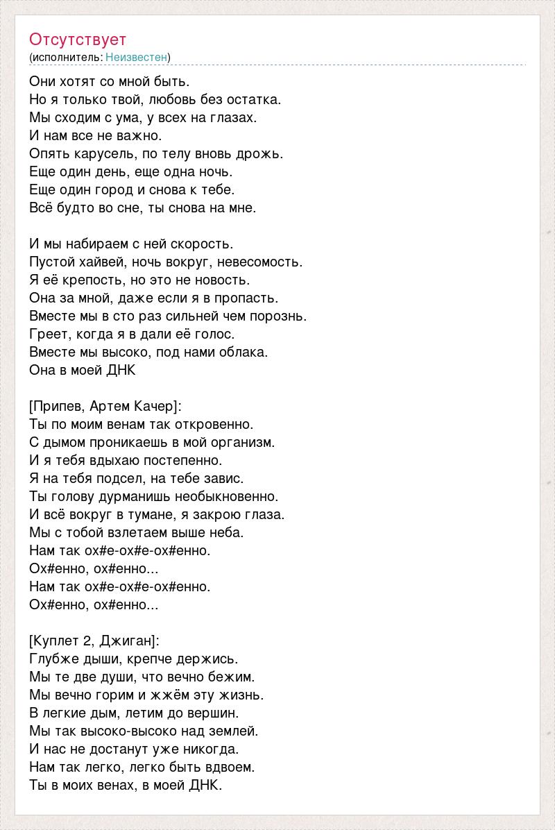 Они хотят со мной быть. Но я только твой, любовь без остатка. Мы сходим с ума, у всех на глазах. И нам все не важно. Опять карусель, по телу вновь дрожь. Еще один день, еще одна ночь. Еще один город и снова к тебе. Всё будто во сне, ты снова на мне. И мы набираем с ней скорость. Пустой хайвей, ночь вокруг, невесомость. Я её крепость, но это не новость. Она за мной, даже если я в пропасть. Вместе мы в сто раз сильней чем порознь. Греет, когда я в дали её голос. Вместе мы высоко, под нами облака. Она в моей ДНК [Припев, Артем Качер]: Ты по моим венам так откровенно. С дымом проникаешь в мой организм. И я тебя вдыхаю постепенно. Я на тебя подсел, на тебе завис. Ты голову дурманишь необыкновенно. И всё вокруг в тумане, я закрою глаза. Мы с тобой взлетаем выше неба. Нам так ох#е-ох#е-ох#енно. Ох#енно, ох#енно... Нам так ох#е-ох#е-ох#енно. Ох#енно, ох#енно... [Куплет 2, Джиган]: Глубже дыши, крепче держись. Мы те две души, что вечно бежим. Мы вечно горим и жжём эту жизнь. В легкие дым, летим до вершин. Мы так высоко-высоко над землей. И нас не достанут уже никогда. Нам так легко, легко быть вдвоем. Ты в моих венах, в моей ДНК.