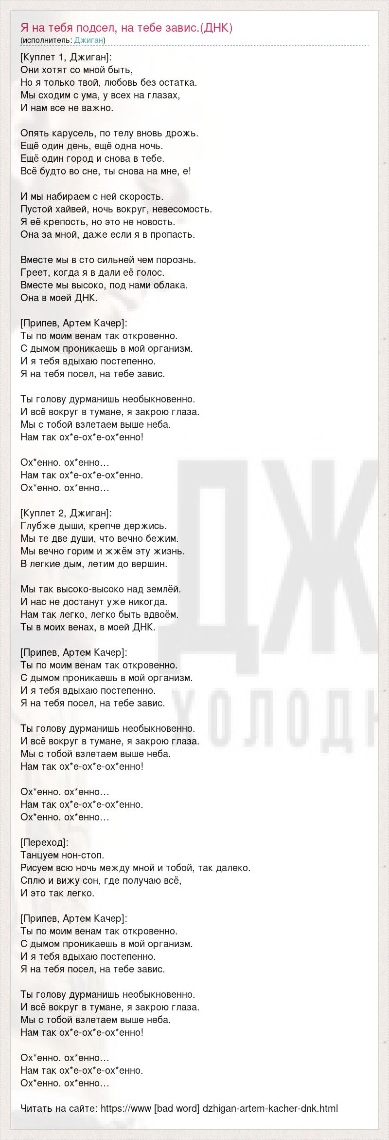 [Куплет 1, Джиган]: Они хотят со мной быть, Но я только твой, любовь без остатка. Мы сходим с ума, у всех на глазах, И нам все не важно. Опять карусель, по телу вновь дрожь. Ещё один день, ещё одна ночь. Ещё один город и снова в тебе. Всё будто во сне, ты снова на мне, е! И мы набираем с ней скорость. Пустой хайвей, ночь вокруг, невесомость. Я её крепость, но это не новость. Она за мной, даже если я в пропасть. Вместе мы в сто сильней чем порознь. Греет, когда я в дали её голос. Вместе мы высоко, под нами облака. Она в моей ДНК. [Припев, Артем Качер]: Ты по моим венам так откровенно. С дымом проникаешь в мой организм. И я тебя вдыхаю постепенно. Я на тебя посел, на тебе завис. Ты голову дурманишь необыкновенно. И всё вокруг в тумане, я закрою глаза. Мы с тобой взлетаем выше неба. Нам так ох*е-ох*е-ох*енно! Ох*енно. ох*енно… Нам так ох*е-ох*е-ох*енно. Ох*енно. ох*енно… [Куплет 2, Джиган]: Глубже дыши, крепче держись. Мы те две души, что вечно бежим. Мы вечно горим и жжём эту жизнь. В легкие дым, летим до вершин. Мы так высоко-высоко над землёй. И нас не достанут уже никогда. Нам так легко, легко быть вдвоём. Ты в моих венах, в моей ДНК. [Припев, Артем Качер]: Ты по моим венам так откровенно. С дымом проникаешь в мой организм. И я тебя вдыхаю постепенно. Я на тебя посел, на тебе завис. Ты голову дурманишь необыкновенно. И всё вокруг в тумане, я закрою глаза. Мы с тобой взлетаем выше неба. Нам так ох*е-ох*е-ох*енно! Ох*енно. ох*енно… Нам так ох*е-ох*е-ох*енно. Ох*енно. ох*енно… [Переход]: Танцуем нон-стоп. Рисуем всю ночь между мной и тобой, так далеко. Сплю и вижу сон, где получаю всё, И это так легко. [Припев, Артем Качер]: Ты по моим венам так откровенно. С дымом проникаешь в мой организм. И я тебя вдыхаю постепенно. Я на тебя посел, на тебе завис. Ты голову дурманишь необыкновенно. И всё вокруг в тумане, я закрою глаза. Мы с тобой взлетаем выше неба. Нам так ох*е-ох*е-ох*енно! Ох*енно. ох*енно… Нам так ох*е-ох*е-ох*енно. Ох*енно. ох*енно… Читать на сайте: https://www [bad word] dzhigan-artem-kacher-dnk.html