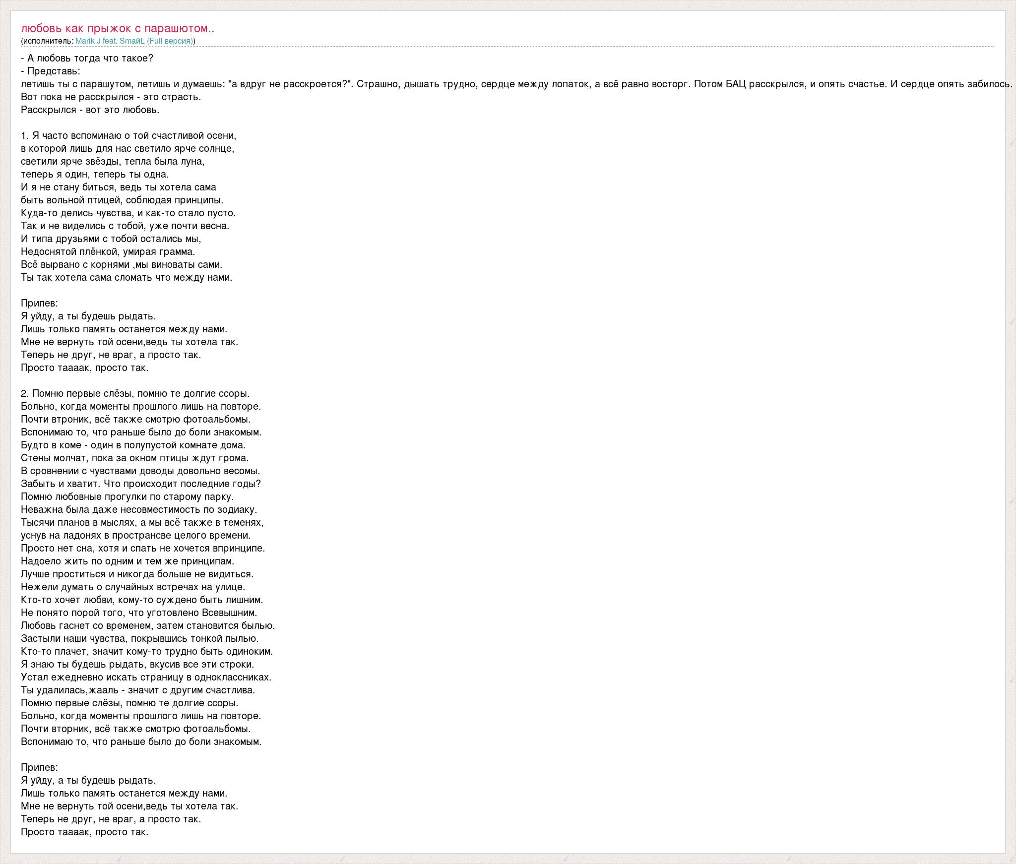 - А любовь тогда что такое? - Представь: летишь ты с парашутом, летишь и думаешь: "а вдруг не расскроется?". Страшно, дышать трудно, сердце между лопаток, а всё равно восторг. Потом БАЦ расскрылся, и опять счастье. И сердце опять забилось. Вот пока не расскрылся - это страсть. Расскрылся - вот это любовь. 1. Я часто вспоминаю о той счастливой осени, в которой лишь для нас светило ярче солнце, светили ярче звёзды, тепла была луна, теперь я один, теперь ты одна. И я не стану биться, ведь ты хотела сама быть вольной птицей, соблюдая принципы. Куда-то делись чувства, и как-то стало пусто. Так и не виделись с тобой, уже почти весна. И типа друзьями с тобой остались мы, Недоснятой плёнкой, умирая грамма. Всё вырвано с корнями ,мы виноваты сами. Ты так хотела сама сломать что между нами. Припев: Я уйду, а ты будешь рыдать. Лишь только память останется между нами. Мне не вернуть той осени,ведь ты хотела так. Теперь не друг, не враг, а просто так. Просто таааак, просто так. 2. Помню первые слёзы, помню те долгие ссоры. Больно, когда моменты прошлого лишь на повторе. Почти втроник, всё также смотрю фотоальбомы. Вспонимаю то, что раньше было до боли знакомым. Будто в коме - один в полупустой комнате дома. Стены молчат, пока за окном птицы ждут грома. В сровнении с чувствами доводы довольно весомы. Забыть и хватит. Что происходит последние годы? Помню любовные прогулки по старому парку. Неважна была даже несовместимость по зодиаку. Тысячи планов в мыслях, а мы всё также в теменях, уснув на ладонях в пространсве целого времени. Просто нет сна, хотя и спать не хочется впринципе. Надоело жить по одним и тем же принципам. Лучше проститься и никогда больше не видиться. Нежели думать о случайных встречах на улице. Кто-то хочет любви, кому-то суждено быть лишним. Не понято порой того, что уготовлено Всевышним. Любовь гаснет со временем, затем становится былью. Застыли наши чувства, покрывшись тонкой пылью. Кто-то плачет, значит кому-то трудно быть одиноким. Я знаю ты будешь рыдать, вкусив все эти строки. Устал ежедневно искать страницу в одноклассниках. Ты удалилась,жааль - значит с другим счастлива. Помню первые слёзы, помню те долгие ссоры. Больно, когда моменты прошлого лишь на повторе. Почти вторник, всё также смотрю фотоальбомы. Вспонимаю то, что раньше было до боли знакомым. Припев: Я уйду, а ты будешь рыдать. Лишь только память останется между нами. Мне не вернуть той осени,ведь ты хотела так. Теперь не друг, не враг, а просто так. Просто таааак, просто так.