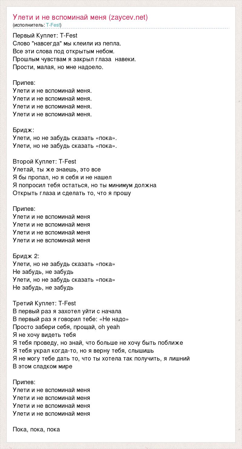 Первый Куплет: T-Fest Слово "навсегда" мы клеили из пепла. Все эти слова под открытым небом. Прошлым чувствам я закрыл глаза навеки. Прости, малая, но мне надоело. Припев: Улети и не вспоминай меня. Улети и не вспоминай меня. Улети и не вспоминай меня. Улети и не вспоминай меня. Бридж: Улети, но не забудь сказать «пока». Улети, но не забудь сказать «пока». Второй Куплет: T-Fest Улетай, ты же знаешь, это все Я бы пропал, но я себя и не нашел Я попросил тебя остаться, но ты минимум должна Открыть глаза и сделать то, что я прошу Припев: Улети и не вспоминай меня Улети и не вспоминай меня Улети и не вспоминай меня Улети и не вспоминай меня Бридж 2: Улети, но не забудь сказать «пока» Не забудь, не забудь Улети, но не забудь сказать «пока» Не забудь, не забудь Третий Куплет: T-Fest В первый раз я захотел уйти с начала В первый раз я говорил тебе: «Не надо» Просто забери себя, прощай, oh yeah Я не хочу видеть тебя Я тебя проведу, но знай, что больше не хочу быть поближе Я тебя украл когда-то, но я верну тебя, слышишь Я не могу тебе дать то, что ты хотела так получить, я лишний В этом сладком мире Припев: Улети и не вспоминай меня Улети и не вспоминай меня Улети и не вспоминай меня Улети и не вспоминай меня Пока, пока, пока