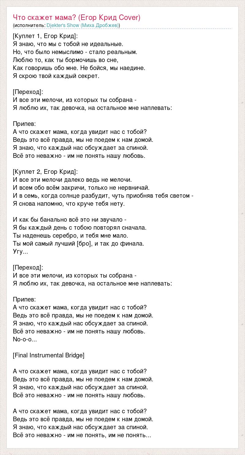 [Куплет 1, Егор Крид]: Я знаю, что мы с тобой не идеальные. Но, что было немыслимо - стало реальным. Люблю то, как ты бормочишь во сне, Как говоришь обо мне. Не бойся, мы наедине. Я скрою твой каждый секрет. [Переход]: И все эти мелочи, из которых ты собрана - Я люблю их, так девочка, на остальное мне наплевать: Припев: А что скажет мама, когда увидит нас с тобой? Ведь это всё правда, мы не поедем к нам домой. Я знаю, что каждый нас обсуждает за спиной. Всё это неважно - им не понять нашу любовь. [Куплет 2, Егор Крид]: И все эти мелочи далеко ведь не мелочи. И всем обо всём закричи, только не нервничай. И в семь, когда солнце разбудит, чуть приобняв тебя светом - Я снова напомню, что круче тебя нету. И как бы банально всё это ни звучало - Я бы каждый день с тобою повторял сначала. Ты наденешь серебро, и тебя мне мало. Ты мой самый лучший [бро], и так до финала. Угу... [Переход]: И все эти мелочи, из которых ты собрана - Я люблю их, так девочка, на остальное мне наплевать: Припев: А что скажет мама, когда увидит нас с тобой? Ведь это всё правда, мы не поедем к нам домой. Я знаю, что каждый нас обсуждает за спиной. Всё это неважно - им не понять нашу любовь. No-o-o... [Final Instrumental Bridge] А что скажет мама, когда увидит нас с тобой? Ведь это всё правда, мы не поедем к нам домой. Я знаю, что каждый нас обсуждает за спиной. Всё это неважно - им не понять нашу любовь. А что скажет мама, когда увидит нас с тобой? Ведь это всё правда, мы не поедем к нам домой. Я знаю, что каждый нас обсуждает за спиной. Всё это неважно - им не понять, им не понять...