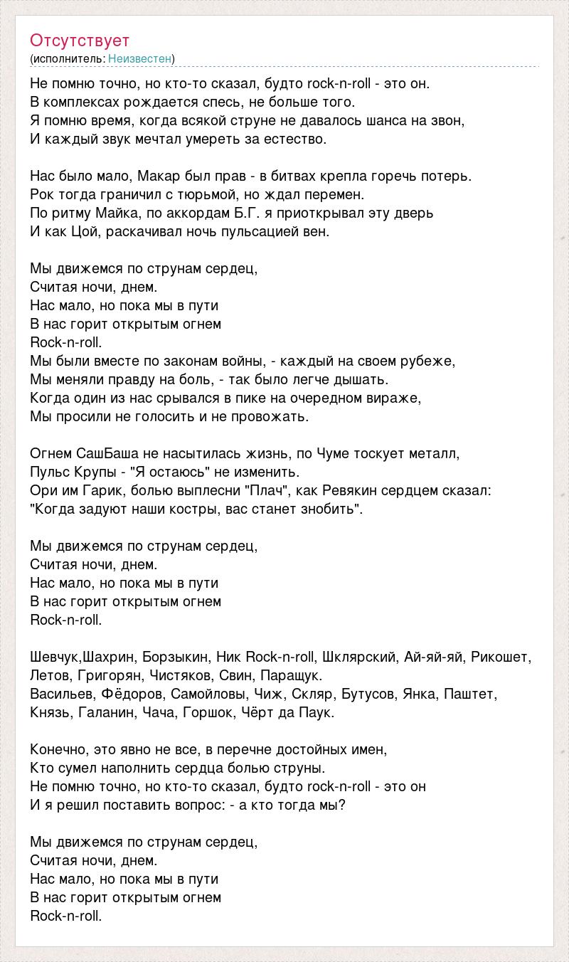 Не помню точно, но кто-то сказал, будто rock-n-roll - это он. В комплексах рождается спесь, не больше того. Я помню время, когда всякой струне не давалось шанса на звон, И каждый звук мечтал умереть за естество. Нас было мало, Макар был прав - в битвах крепла горечь потерь. Рок тогда граничил с тюрьмой, но ждал перемен. По ритму Майка, по аккордам Б.Г. я приоткрывал эту дверь И как Цой, раскачивал ночь пульсацией вен. Мы движемся по струнам сердец, Считая ночи, днем. Нас мало, но пока мы в пути В нас горит открытым огнем Rock-n-roll. Мы были вместе по законам войны, - каждый на своем рубеже, Мы меняли правду на боль, - так было легче дышать. Когда один из нас срывался в пике на очередном вираже, Мы просили не голосить и не провожать. Огнем СашБаша не насытилась жизнь, по Чуме тоскует металл, Пульс Крупы - "Я остаюсь" не изменить. Ори им Гарик, болью выплесни "Плач", как Ревякин сердцем сказал: "Когда задуют наши костры, вас станет знобить". Мы движемся по струнам сердец, Считая ночи, днем. Нас мало, но пока мы в пути В нас горит открытым огнем Rock-n-roll. Шевчук,Шахрин, Борзыкин, Ник Rock-n-roll, Шклярский, Ай-яй-яй, Рикошет, Летов, Григорян, Чистяков, Свин, Паращук. Васильев, Фёдоров, Самойловы, Чиж, Скляр, Бутусов, Янка, Паштет, Князь, Галанин, Чача, Горшок, Чёрт да Паук. Конечно, это явно не все, в перечне достойных имен, Кто сумел наполнить сердца болью струны. Не помню точно, но кто-то сказал, будто rock-n-roll - это он И я решил поставить вопрос: - а кто тогда мы? Мы движемся по струнам сердец, Считая ночи, днем. Нас мало, но пока мы в пути В нас горит открытым огнем Rock-n-roll.