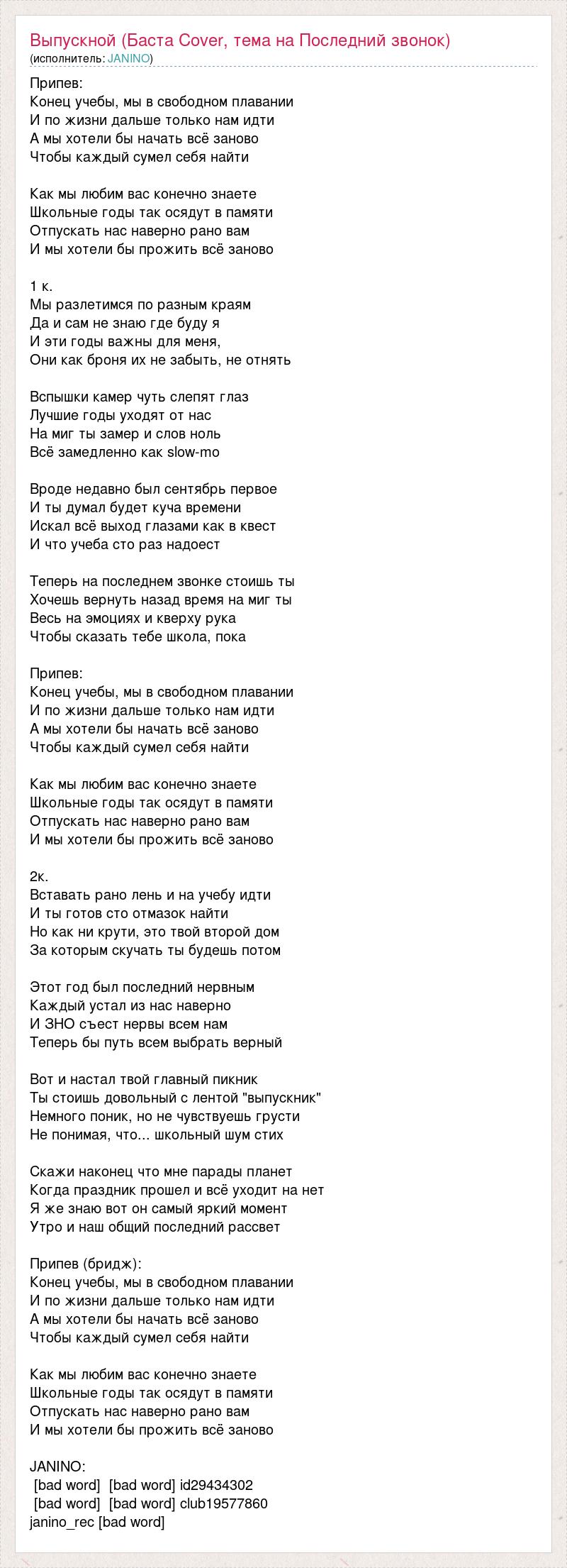 Припев: Конец учебы, мы в свободном плавании И по жизни дальше только нам идти А мы хотели бы начать всё заново Чтобы каждый сумел себя найти Как мы любим вас конечно знаете Школьные годы так осядут в памяти Отпускать нас наверно рано вам И мы хотели бы прожить всё заново 1 к. Мы разлетимся по разным краям Да и сам не знаю где буду я И эти годы важны для меня, Они как броня их не забыть, не отнять Вспышки камер чуть слепят глаз Лучшие годы уходят от нас На миг ты замер и слов ноль Всё замедленно как slow-mo Вроде недавно был сентябрь первое И ты думал будет куча времени Искал всё выход глазами как в квест И что учеба сто раз надоест Теперь на последнем звонке стоишь ты Хочешь вернуть назад время на миг ты Весь на эмоциях и кверху рука Чтобы сказать тебе школа, пока Припев: Конец учебы, мы в свободном плавании И по жизни дальше только нам идти А мы хотели бы начать всё заново Чтобы каждый сумел себя найти Как мы любим вас конечно знаете Школьные годы так осядут в памяти Отпускать нас наверно рано вам И мы хотели бы прожить всё заново 2к. Вставать рано лень и на учебу идти И ты готов сто отмазок найти Но как ни крути, это твой второй дом За которым скучать ты будешь потом Этот год был последний нервным Каждый устал из нас наверно И ЗНО съест нервы всем нам Теперь бы путь всем выбрать верный Вот и настал твой главный пикник Ты стоишь довольный с лентой "выпускник" Немного поник, но не чувствуешь грусти Не понимая, что... школьный шум стих Скажи наконец что мне парады планет Когда праздник прошел и всё уходит на нет Я же знаю вот он самый яркий момент Утро и наш общий последний рассвет Припев (бридж): Конец учебы, мы в свободном плавании И по жизни дальше только нам идти А мы хотели бы начать всё заново Чтобы каждый сумел себя найти Как мы любим вас конечно знаете Школьные годы так осядут в памяти Отпускать нас наверно рано вам И мы хотели бы прожить всё заново JANINO: [bad word] [bad word] id29434302 [bad word] [bad word] club19577860 janino_rec [bad word]