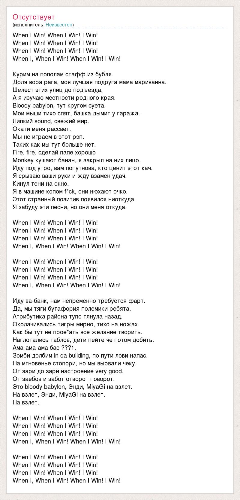 When I Win! When I Win! I Win! When I Win! When I Win! I Win! When I Win! When I Win! I Win! When I, When I Win! When I Win! I Win! Курим на пополам стафф из бубля. Доля вора рага, моя лучшая подруга мама мариванна. Шелест этих улиц до подъезда, А я изучаю местности родного края. Bloody babylon, тут кругом суета. Мои мыши тихо спят, башка дымит у гаража. Липкий sound, свежий мир. Окати меня рассвет. Мы не играем в этот рэп. Таких как мы тут больше нет. Fire, fire, сделай папе хорошо Monkey кушают банан, я закрыл на них лицо. Иду под утро, вам попутнова, кто ценит этот кач. Я срываю ваши руки и жду взамен удач. Кинул тени на окно. Я в машине копом f*ck, они нюхают очко. Этот странный позитив появился ниоткуда. Я забуду эти песни, но они меня откуда. When I Win! When I Win! I Win! When I Win! When I Win! I Win! When I Win! When I Win! I Win! When I, When I Win! When I Win! I Win! When I Win! When I Win! I Win! When I Win! When I Win! I Win! When I Win! When I Win! I Win! When I, When I Win! When I Win! I Win! Иду ва-банк, нам непременно требуется фарт. Да, мы тяги бутафория полемики ребята. Атрибутика района тупо тянула назад. Околачивались тигры мирно, тихо на ножах. Как бы тут не прое*ать все желание творить. Наглотались таблов, дети пейте че потом добить. Ама-ама-ама бас ???1. Зомби долбим in da building, по пути лови напас. На мгновенье стопори, но мы вырвали чеку. От зари до зари настроение very good. От заебов и забот отворот поворот. Это bloody babylon, Энди, MiyaGi на взлет. На взлет, Энди, MiyaGi на взлет. На взлет. When I Win! When I Win! I Win! When I Win! When I Win! I Win! When I Win! When I Win! I Win! When I, When I Win! When I Win! I Win! When I Win! When I Win! I Win! When I Win! When I Win! I Win! When I Win! When I Win! I Win! When I, When I Win! When I Win! I Win!