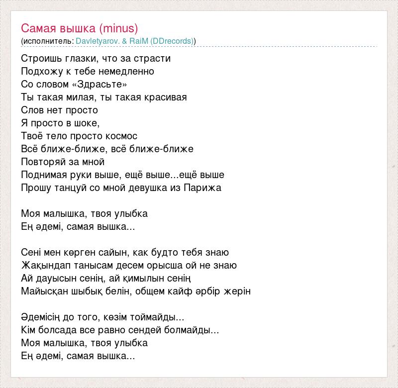 Строишь глазки, что за страсти Подхожу к тебе немедленно Со словом «Здрасьте» Ты такая милая, ты такая красивая Слов нет просто Я просто в шоке, Твоё тело просто космос Всё ближе-ближе, всё ближе-ближе Повторяй за мной Поднимая руки выше, ещё выше...ещё выше Прошу танцуй со мной девушка из Парижа Моя малышка, твоя улыбка Ең әдемі, самая вышка... Сені мен көрген сайын, как будто тебя знаю Жақындап танысам десем орысша ой не знаю Ай дауысын сенің, ай қимылын сенің Майысқан шыбық белін, общем кайф әрбір жерін Әдемісің до того, көзім тоймайды... Кім болсада все равно сендей болмайды... Моя малышка, твоя улыбка Ең әдемі, самая вышка...