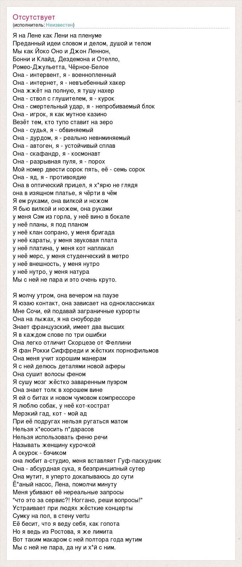 Я на Лене как Лени на пленуме Преданный идеи словом и делом, душой и телом Мы как Йоко Оно и Джон Леннон, Бонни и Клайд, Дездемона и Отелло, Ромео-Джульетта, Чёрное-Белое Она - интервент, я - военнопленный Она - интернет, я - невъебенный хакер Она жжёт на полную, я тушу нахер Она - ствол с глушителем, я - курок Она - смертельный удар, я - непробиваемый блок Она - игрок, я как мутное казино Везёт тем, кто тупо ставит на зеро Она - судья, я - обвиняемый Она - дурдом, я - реально невнминяемый Она - автоген, я - устойчивый сплав Она - скафандр, я - космонавт Она - разрывная пуля, я - порох Мой номер двести сорок пять, её - семь сорок Она - яд, я - противоядие Она в оптический прицел, я х*ярю не глядя она в изящном платье, я чёрти в чём Я ем руками, она вилкой и ножом Я бью вилкой и ножем, она руками у меня Сэм из горла, у неё вино в бокале у неё планы, я под планом у неё клан сопрано, у меня бригада у неё караты, у меня звуковая плата у неё платина, у меня кот наплакал у неё мерс, у меня студенческий в метро у неё внешность, у меня нутро у неё нутро, у меня натура Мы с ней не пара и это очень круто. Я молчу утром, она вечером на паузе Я юзаю контакт, она зависает на одноклассниках Мне Сочи, ей подавай заграничные курорты Она на лыжах, я на сноуборде Знает французский, имеет два высших Я в каждом слове по три ошибки Она легко отличит Скорцезе от Феллини Я фан Рокки Сиффреди и жёстких порнофильмов Она меня учит хорошим манерам Я с ней делюсь деталями новой аферы Она сушит волосы феном Я сушу мозг жёстко заваренным пуэром Она знает толк в хорошем вине Я ей о битах и новом чумовом компрессоре Я люблю собак, у неё кот-кострат Мерзкий гад, кот - мой ад При её подругах нельзя ругаться матом Нельзя х*есосить п*дарасов Нельзя использовать феню речи Называть женщину курочкой А окурок - бэчиком она любит а-студио, меня вставляет Гуф-паскудник Она - абсурдная сука, я безпринципный сутер Она мутит, я уперто докапываюсь до сути Ё*аный насос, Лена, помолчи минуту Меня убивают её нереальные запросы "что это за сервис?! Ноггано, реши вопросы!" Устраивает при людях жёсткие концерты Сумку на пол, в стену vertu Её бесит, что я веду себя, как гопота Но я ведь из Ростова, я же лимита Вот таким макаром с ней полтора года мутим Мы с ней не пара, да ну и х*й с ним.