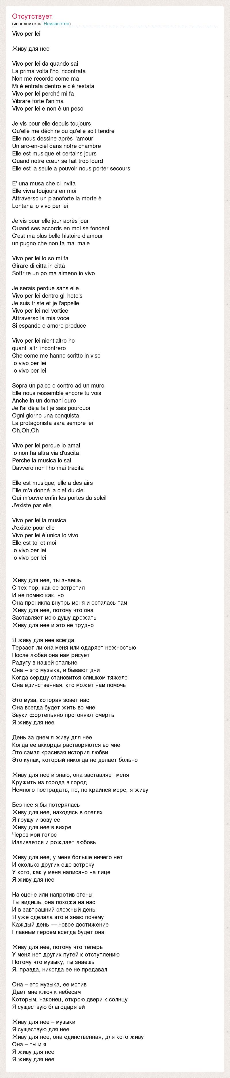 Vivo per lei Живу для нее Vivo per lei da quando sai La prima volta l'ho incontrata Non me recordo come ma Mi è entrata dentro e c'è restata Vivo per lei perché mi fa Vibrare forte l'anima Vivo per lei e non è un peso Je vis pour elle depuis toujours Qu'elle me déchire ou qu'elle soit tendre Elle nous dessine après l'amour Un arc-en-ciel dans notre chambre Elle est musique et certains jours Quand notre cœur se fait trop lourd Elle est la seule а pouvoir nous porter secours E' una musa che ci invita Elle vivra toujours en moi Attraverso un pianoforte la morte è Lontana io vivo per lei Je vis pour elle jour après jour Quand ses accords en moi se fondent C'est ma plus belle histoire d'amour un pugno che non fa mai male Vivo per lei lo so mi fa Girare di citta in città Soffrire un po ma almeno io vivo Je serais perdue sans elle Vivo per lei dentro gli hotels Je suis triste et je l'appelle Vivo per lei nel vortice Attraverso la mia voce Si espande e amore produce Vivo per lei nient'altro ho quanti altri incontrero Che come me hanno scritto in viso Io vivo per lei Io vivo per lei Sopra un palco o contro ad un muro Elle nous ressemble encore tu vois Anche in un domani duro Je l'ai déjа fait je sais pourquoi Ogni glorno una conquista La protagonista sara sempre lei Oh,Oh,Oh Vivo per lei perque lo amai Io non ha altra via d'uscita Perche la musica lo sai Davvero non l'ho mai tradita Elle est musique, elle a des airs Elle m'a donné la clef du ciel Qui m'ouvre enfin les portes du soleil J'existe par elle Vivo per lei la musica J'existe pour elle Vivo per lei è unica lo vivo Elle est toi et moi Io vivo per lei Io vivo per lei Живу для нее, ты знаешь, С тех пор, как ее встретил И не помню как, но Она проникла внутрь меня и осталась там Живу для нее, потому что она Заставляет мою душу дрожать Живу для нее и это не трудно Я живу для нее всегда Терзает ли она меня или одаряет нежностью После любви она нам рисует Радугу в нашей спальне Она – это музыка, и бывают дни Когда сердцу становится слишком тяжело Она единственная, кто может нам помочь Это муза, которая зовет нас Она всегда будет жить во мне Звуки фортепьяно прогоняют смерть Я живу для нее День за днем я живу для нее Когда ее аккорды растворяются во мне Это самая красивая история любви Это кулак, который никогда не делает больно Живу для нее и знаю, она заставляет меня Кружить из города в город Немного пострадать, но, по крайней мере, я живу Без нее я бы потерялась Живу для нее, находясь в отелях Я грущу и зову ее Живу для нее в вихре Через мой голос Изливается и рождает любовь Живу для нее, у меня больше ничего нет И сколько других еще встречу У кого, как у меня написано на лице Я живу для нее На сцене или напротив стены Ты видишь, она похожа на нас И в завтрашний сложный день Я уже сделала это и знаю почему Каждый день — новое достижение Главным героем всегда будет она Живу для нее, потому что теперь У меня нет других путей к отступлению Потому что музыку, ты знаешь Я, правда, никогда ее не предавал Она – это музыка, ее мотив Дает мне ключ к небесам Которым, наконец, открою двери к солнцу Я существую благодаря ей Живу для нее – музыки Я существую для нее Живу для нее, она единственная, для кого живу Она – ты и я Я живу для нее Я живу для нее