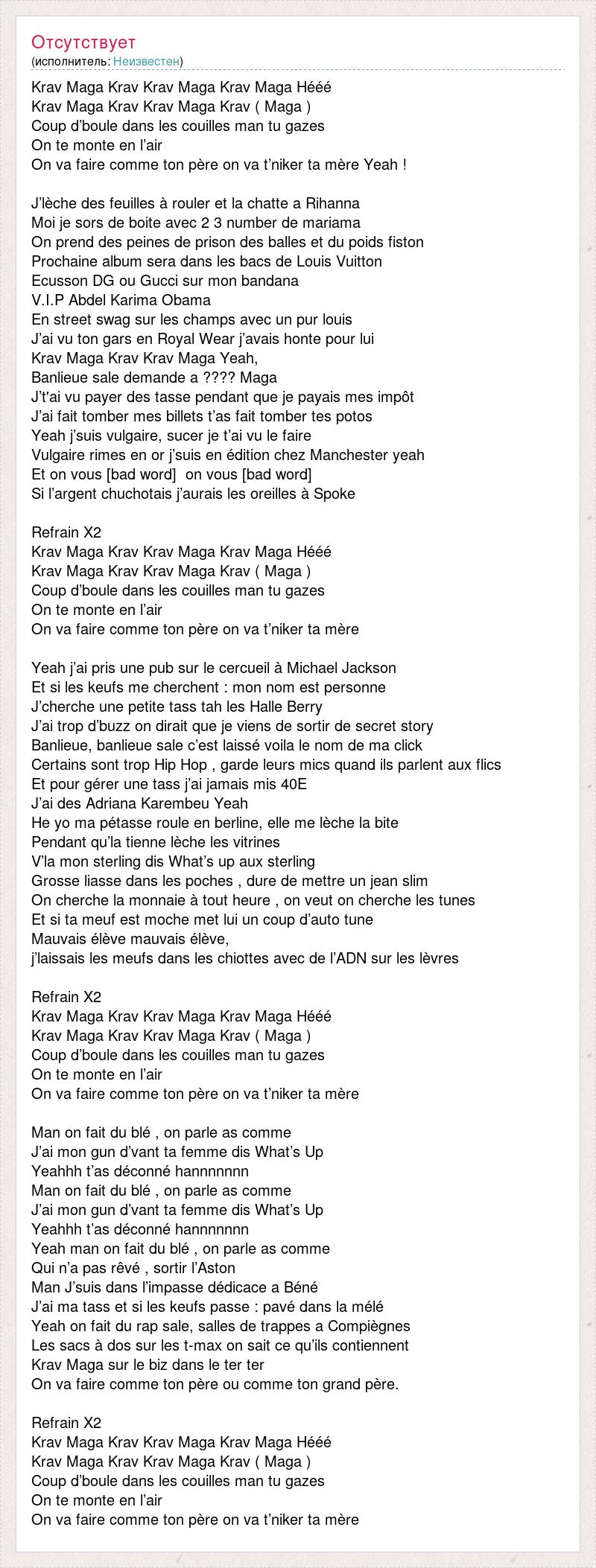 Krav Maga Krav Krav Maga Krav Maga Hééé Krav Maga Krav Krav Maga Krav ( Maga ) Coup d’boule dans les couilles man tu gazes On te monte en l’air On va faire comme ton père on va t’niker ta mère Yeah ! J’lèche des feuilles à rouler et la chatte a Rihanna Moi je sors de boite avec 2 3 number de mariama On prend des peines de prison des balles et du poids fiston Prochaine album sera dans les bacs de Louis Vuitton Ecusson DG ou Gucci sur mon bandana V.I.P Abdel Karima Obama En street swag sur les champs avec un pur louis J’ai vu ton gars en Royal Wear j’avais honte pour lui Krav Maga Krav Krav Maga Yeah, Banlieue sale demande a ???? Maga J’t'ai vu payer des tasse pendant que je payais mes impôt J’ai fait tomber mes billets t’as fait tomber tes potos Yeah j’suis vulgaire, sucer je t’ai vu le faire Vulgaire rimes en or j’suis en édition chez Manchester yeah Et on vous [bad word] on vous [bad word] Si l’argent chuchotais j’aurais les oreilles à Spoke Refrain X2 Krav Maga Krav Krav Maga Krav Maga Hééé Krav Maga Krav Krav Maga Krav ( Maga ) Coup d’boule dans les couilles man tu gazes On te monte en l’air On va faire comme ton père on va t’niker ta mère Yeah j’ai pris une pub sur le cercueil à Michael Jackson Et si les keufs me cherchent : mon nom est personne J’cherche une petite tass tah les Halle Berry J’ai trop d’buzz on dirait que je viens de sortir de secret story Banlieue, banlieue sale c’est laissé voila le nom de ma click Certains sont trop Hip Hop , garde leurs mics quand ils parlent aux flics Et pour gérer une tass j’ai jamais mis 40E J’ai des Adriana Karembeu Yeah He yo ma pétasse roule en berline, elle me lèche la bite Pendant qu’la tienne lèche les vitrines V’la mon sterling dis What’s up aux sterling Grosse liasse dans les poches , dure de mettre un jean slim On cherche la monnaie à tout heure , on veut on cherche les tunes Et si ta meuf est moche met lui un coup d’auto tune Mauvais élève mauvais élève, j’laissais les meufs dans les chiottes avec de l’ADN sur les lèvres Refrain X2 Krav Maga Krav Krav Maga Krav Maga Hééé Krav Maga Krav Krav Maga Krav ( Maga ) Coup d’boule dans les couilles man tu gazes On te monte en l’air On va faire comme ton père on va t’niker ta mère Man on fait du blé , on parle as comme J’ai mon gun d’vant ta femme dis What’s Up Yeahhh t’as déconné hannnnnnn Man on fait du blé , on parle as comme J’ai mon gun d’vant ta femme dis What’s Up Yeahhh t’as déconné hannnnnnn Yeah man on fait du blé , on parle as comme Qui n’a pas rêvé , sortir l’Aston Man J’suis dans l’impasse dédicace a Béné J’ai ma tass et si les keufs passe : pavé dans la mélé Yeah on fait du rap sale, salles de trappes a Compiègnes Les sacs à dos sur les t-max on sait ce qu’ils contiennent Krav Maga sur le biz dans le ter ter On va faire comme ton père ou comme ton grand père. Refrain X2 Krav Maga Krav Krav Maga Krav Maga Hééé Krav Maga Krav Krav Maga Krav ( Maga ) Coup d’boule dans les couilles man tu gazes On te monte en l’air On va faire comme ton père on va t’niker ta mère