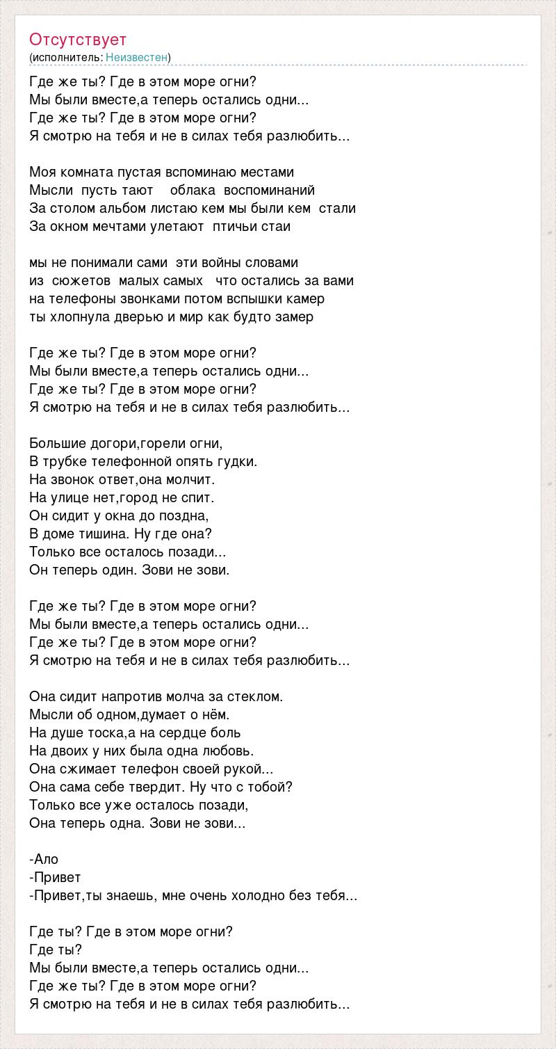 Где же ты? Где в этом море огни? Мы были вместе,а теперь остались одни... Где же ты? Где в этом море огни? Я смотрю на тебя и не в силах тебя разлюбить... Моя комната пустая вспоминаю местами Мысли пусть тают облака воспоминаний За столом альбом листаю кем мы были кем стали За окном мечтами улетают птичьи стаи мы не понимали сами эти войны словами из сюжетов малых самых что остались за вами на телефоны звонками потом вспышки камер ты хлопнула дверью и мир как будто замер Где же ты? Где в этом море огни? Мы были вместе,а теперь остались одни... Где же ты? Где в этом море огни? Я смотрю на тебя и не в силах тебя разлюбить... Большие догори,горели огни, В трубке телефонной опять гудки. На звонок ответ,она молчит. На улице нет,город не спит. Он сидит у окна до поздна, В доме тишина. Ну где она? Только все осталось позади... Он теперь один. Зови не зови. Где же ты? Где в этом море огни? Мы были вместе,а теперь остались одни... Где же ты? Где в этом море огни? Я смотрю на тебя и не в силах тебя разлюбить... Она сидит напротив молча за стеклом. Мысли об одном,думает о нём. На душе тоска,а на сердце боль На двоих у них была одна любовь. Она сжимает телефон своей рукой... Она сама себе твердит. Ну что с тобой? Только все уже осталось позади, Она теперь одна. Зови не зови... -Ало -Привет -Привет,ты знаешь, мне очень холодно без тебя... Где ты? Где в этом море огни? Где ты? Мы были вместе,а теперь остались одни... Где же ты? Где в этом море огни? Я смотрю на тебя и не в силах тебя разлюбить...