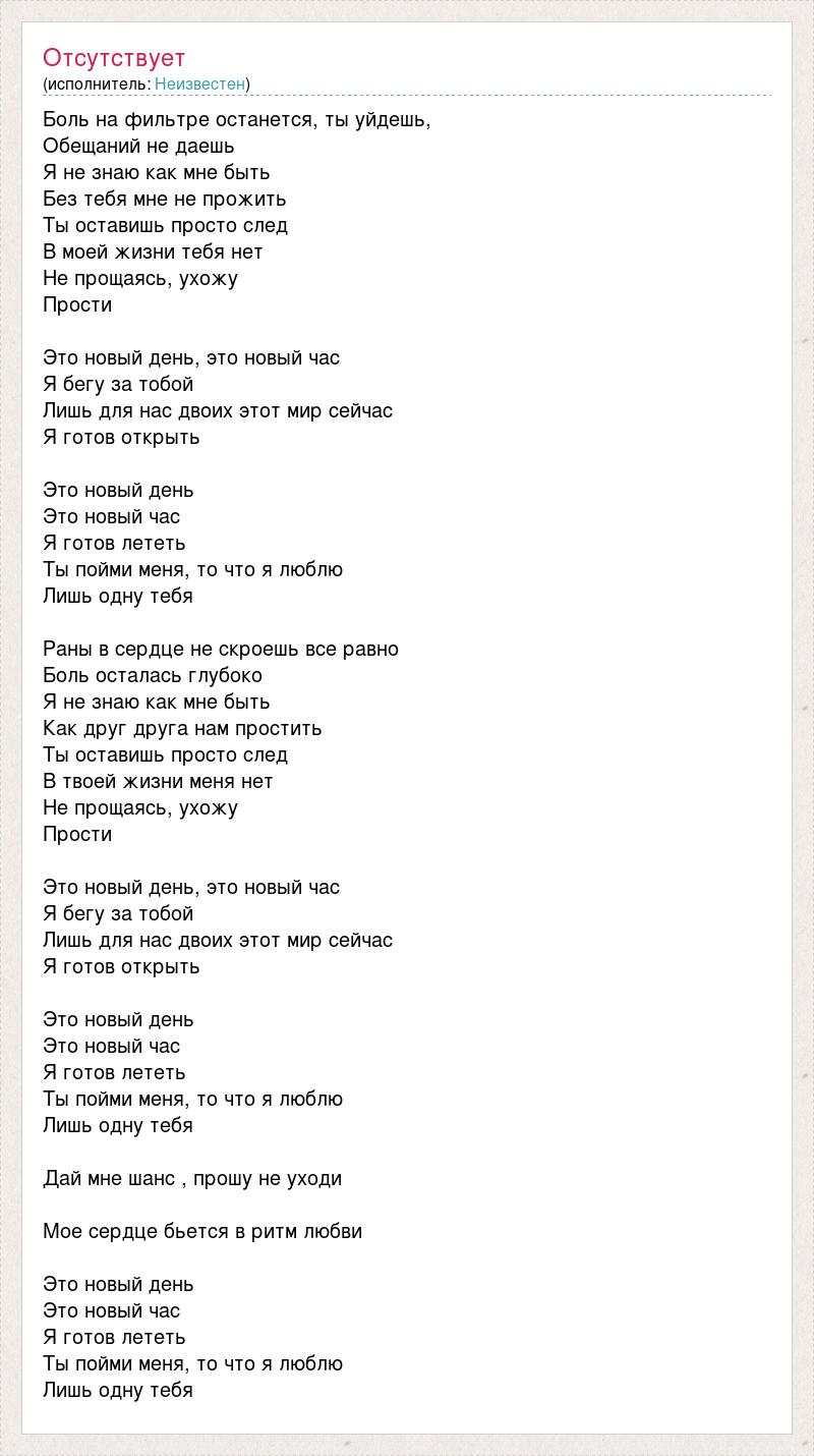 Боль на фильтре останется, ты уйдешь, Обещаний не даешь Я не знаю как мне быть Без тебя мне не прожить Ты оставишь просто след В моей жизни тебя нет Не прощаясь, ухожу Прости Это новый день, это новый час Я бегу за тобой Лишь для нас двоих этот мир сейчас Я готов открыть Это новый день Это новый час Я готов лететь Ты пойми меня, то что я люблю Лишь одну тебя Раны в сердце не скроешь все равно Боль осталась глубоко Я не знаю как мне быть Как друг друга нам простить Ты оставишь просто след В твоей жизни меня нет Не прощаясь, ухожу Прости Это новый день, это новый час Я бегу за тобой Лишь для нас двоих этот мир сейчас Я готов открыть Это новый день Это новый час Я готов лететь Ты пойми меня, то что я люблю Лишь одну тебя Дай мне шанс , прошу не уходи Мое сердце бьется в ритм любви Это новый день Это новый час Я готов лететь Ты пойми меня, то что я люблю Лишь одну тебя