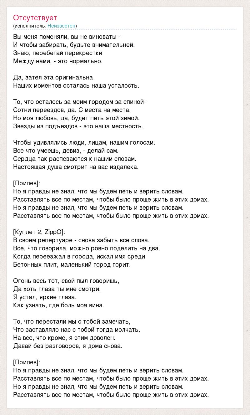 Вы меня поменяли, вы не виноваты - И чтобы забирать, будьте внимательней. Знаю, перебегай перекрестки Между нами, - это нормально. Да, затея эта оригинальна Наших моментов осталась наша усталость. То, что осталось за моим городом за спиной - Сотни переездов, да. С места на места. Но моя любовь, да, будет петь этой зимой. Звезды из подъездов - это наша местность. Чтобы удивлялись люди, лицам, нашим голосам. Все что умеешь, девиз, - делай сам. Сердца так распеваются к нашим словам. Настоящая душа смотрит на вас издалека. [Припев]: Но я правды не знал, что мы будем петь и верить словам. Расставлять все по местам, чтобы было проще жить в этих домах. Но я правды не знал, что мы будем петь и верить словам. Расставлять все по местам, чтобы было проще жить в этих домах. [Куплет 2, ZippO]: В своем репертуаре - снова забыть все слова. Всё, что говорила, можно ровно поделить на два. Когда переезжал в города, искал имя среди Бетонных плит, маленький город горит. Огонь весь тот, свой пыл говоришь, Да хоть глаза ты мне смотри. Я устал, яркие глаза. Как узнать, где боль моя вина. То, что перестали мы с тобой замечать, Что заставляло нас с тобой тогда молчать. На все, что кроме, я этим доволен. Давай без разговоров, я дома снова. [Припев]: Но я правды не знал, что мы будем петь и верить словам. Расставлять все по местам, чтобы было проще жить в этих домах. Но я правды не знал, что мы будем петь и верить словам. Расставлять все по местам, чтобы было проще жить в этих домах.