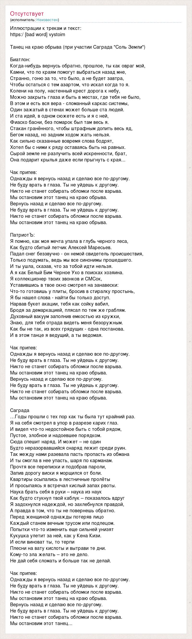 Иллюстрации к трекам и текст: https:/ [bad word] vystoim Танец на краю обрыва (при участии Саграда "Соль Земли") Биатлон: Когда-нибудь вернусь обратно, прошлое, ты как овраг мой, Камни, что по краям помогут выбраться назад мне, Странно, гоню за то, что было, а не будет завтра, Чтобы остаться с тем азартом, что искал когда то я. Колени на полу, настенный крест дорога к небу, Можно закрыть глаза и быть в местах, где тебя не было, В этом и есть вся вера - сломанный каркас системы, Один зажатый в стенах может больше ста людей. И ста идей, в одном сюжете есть и я с ней, Фиаско басни, без помарок был там весь я. Стакан гранённого, чтобы штрафным допить весь яд, Бегом назад, но задним ходом жать нельзя. Как сильно сказанные вовремя слова бодрят, Хотел бы с ними к ряду оставаясь быть на равных. Сырой земле не разлучить всей искренности, брат, Она подарит крылья даже если прыгнуть с края... Чак припев: Однажды я вернусь назад и сделаю все по-другому. Не буду врать в глаза. Ты не уйдешь к другому. Никто не станет собирать обломки после взрыва. Мы остановим этот танец на краю обрыва. Вернусь назад и сделаю все по-другому. Не буду врать в глаза. Ты не уйдешь к другому. Никто не станет собирать обломки после взрыва. Мы остановим этот танец на краю обрыва. ПатриотЪ: Я помню, как моя мечта упала в глубь черного леса, Как будто сбитый летчик Алексей Маресьев. Падал снег беззвучно - он немой свидетель происшествия, Только подумать, ведь мы все синонимы прошедшего. И ты ушла, сказав, что за тобой идти нельзя. А я как Белый Бим Черное Ухо в поисках хозяина. Я коллекционер твоих звонков и СМСок, Уставившись в твое окно смотрел на занавески: Что-то готовишь у плиты, бросив в стиралку простынь, Я бы нашел слова - найти бы только доступ. Нарвав букет акации, тебя как сойку вабил, Бродя за демаркацией, плясал по тем же граблям. Духовный вакуум заполнив емкостью из кружки, Знаю, для тебя отрада видеть меня безоружным. Как бы не так, из всех грядущих - одна постанова. И в этом танце я ведущий, а ты ведомая. Чак припев: Однажды я вернусь назад и сделаю все по-другому. Не буду врать в глаза. Ты не уйдешь к другому. Никто не станет собирать обломки после взрыва. Мы остановим этот танец на краю обрыва. Вернусь назад и сделаю все по-другому. Не буду врать в глаза. Ты не уйдешь к другому. Никто не станет собирать обломки после взрыва. Мы остановим этот танец на краю обрыва. Саграда …Годы прошли с тех пор как ты была тут крайний раз. Я на себя смотрел в упор в разрезе карих глаз. И видел что-то недостойное быть с тобой рядом, Пустое, злобное и надоевшее порядком. Сюда спешит наряд. И может – не один Будто неразорвавшийся снаряд лежит среди руин. Так между нами разевала пасть пропасть из обмана И ты смогла в нее упасть, шаря по карманам. Прочтя все переписки и подобрав пароли, Запив дорогу виски я морщился от боли. Квартиры осыпались в лестничные пролёты И просыпаясь я встречал кислый запах рвоты. Наука брать себя в руки – наука из наук Как будто стукнул твой каблук – показалось вдруг Я задохнулся надеждой, но захлебнулся правдой, А правда в том, что ты не повернешь обратно. Перед женщиной однажды потеряв лицо Каждый станем вечным трусом или подлецом. Попытки что-то изменить еще сильней унизят Кукушка улетит за ней, как у Кена Кизи. И если виноват ты, то терпи Плесни на вату кислоты и вытрави те дни. Кому-то зла желать – это не дел
