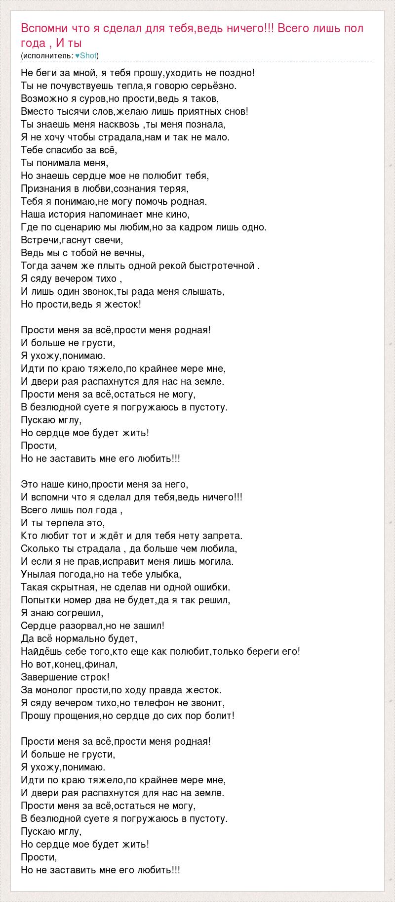 Не беги за мной, я тебя прошу,уходить не поздно! Ты не почувствуешь тепла,я говорю серьёзно. Возможно я суров,но прости,ведь я таков, Вместо тысячи слов,желаю лишь приятных снов! Ты знаешь меня насквозь ,ты меня познала, Я не хочу чтобы страдала,нам и так не мало. Тебе спасибо за всё, Ты понимала меня, Но знаешь сердце мое не полюбит тебя, Признания в любви,сознания теряя, Тебя я понимаю,не могу помочь родная. Наша история напоминает мне кино, Где по сценарию мы любим,но за кадром лишь одно. Встречи,гаснут свечи, Ведь мы с тобой не вечны, Тогда зачем же плыть одной рекой быстротечной . Я сяду вечером тихо , И лишь один звонок,ты рада меня слышать, Но прости,ведь я жесток! Прости меня за всё,прости меня родная! И больше не грусти, Я ухожу,понимаю. Идти по краю тяжело,по крайнее мере мне, И двери рая распахнутся для нас на земле. Прости меня за всё,остаться не могу, В безлюдной суете я погружаюсь в пустоту. Пускаю мглу, Но сердце мое будет жить! Прости, Но не заставить мне его любить!!! Это наше кино,прости меня за него, И вспомни что я сделал для тебя,ведь ничего!!! Всего лишь пол года , И ты терпела это, Кто любит тот и ждёт и для тебя нету запрета. Сколько ты страдала , да больше чем любила, И если я не прав,исправит меня лишь могила. Унылая погода,но на тебе улыбка, Такая скрытная, не сделав ни одной ошибки. Попытки номер два не будет,да я так решил, Я знаю согрешил, Сердце разорвал,но не зашил! Да всё нормально будет, Найдёшь себе того,кто еще как полюбит,только береги его! Но вот,конец,финал, Завершение строк! За монолог прости,по ходу правда жесток. Я сяду вечером тихо,но телефон не звонит, Прошу прощения,но сердце до сих пор болит! Прости меня за всё,прости меня родная! И больше не грусти, Я ухожу,понимаю. Идти по краю тяжело,по крайнее мере мне, И двери рая распахнутся для нас на земле. Прости меня за всё,остаться не могу, В безлюдной суете я погружаюсь в пустоту. Пускаю мглу, Но сердце мое будет жить! Прости, Но не заставить мне его любить!!!