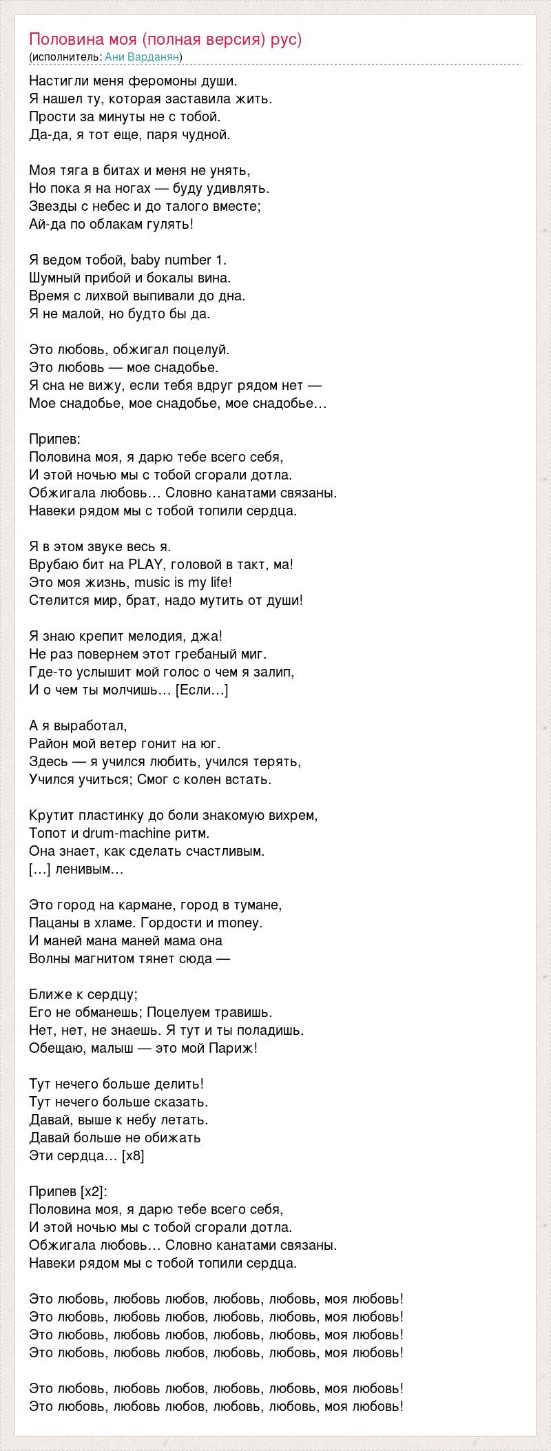 Настигли меня феромоны души. Я нашел ту, которая заставила жить. Прости за минуты не с тобой. Да-да, я тот еще, паря чудной. Моя тяга в битах и меня не унять, Но пока я на ногах — буду удивлять. Звезды с небес и до талого вместе; Ай-да по облакам гулять! Я ведом тобой, baby number 1. Шумный прибой и бокалы вина. Время с лихвой выпивали до дна. Я не малой, но будто бы да. Это любовь, обжигал поцелуй. Это любовь — мое снадобье. Я сна не вижу, если тебя вдруг рядом нет — Мое снадобье, мое снадобье, мое снадобье… Припев: Половина моя, я дарю тебе всего себя, И этой ночью мы с тобой сгорали дотла. Обжигала любовь… Словно канатами связаны. Навеки рядом мы с тобой топили сердца. Я в этом звуке весь я. Врубаю бит на PLAY, головой в такт, ма! Это моя жизнь, music is my life! Стелится мир, брат, надо мутить от души! Я знаю крепит мелодия, джа! Не раз повернем этот гребаный миг. Где-то услышит мой голос о чем я залип, И о чем ты молчишь… [Если…] А я выработал, Район мой ветер гонит на юг. Здесь — я учился любить, учился терять, Учился учиться; Смог с колен встать. Крутит пластинку до боли знакомую вихрем, Топот и drum-machine ритм. Она знает, как сделать счастливым. […] ленивым… Это город на кармане, город в тумане, Пацаны в хламе. Гордости и money. И маней мана маней мама она Волны магнитом тянет сюда — Ближе к сердцу; Его не обманешь; Поцелуем травишь. Нет, нет, не знаешь. Я тут и ты поладишь. Обещаю, малыш — это мой Париж! Тут нечего больше делить! Тут нечего больше сказать. Давай, выше к небу летать. Давай больше не обижать Эти сердца… [x8] Припев [x2]: Половина моя, я дарю тебе всего себя, И этой ночью мы с тобой сгорали дотла. Обжигала любовь… Словно канатами связаны. Навеки рядом мы с тобой топили сердца. Это любовь, любовь любов, любовь, любовь, моя любовь! Это любовь, любовь любов, любовь, любовь, моя любовь! Это любовь, любовь любов, любовь, любовь, моя любовь! Это любовь, любовь любов, любовь, любовь, моя любовь! Это любовь, любовь любов, любовь, любовь, моя любовь! Это любовь, любовь любов, любовь, любовь, моя любовь!